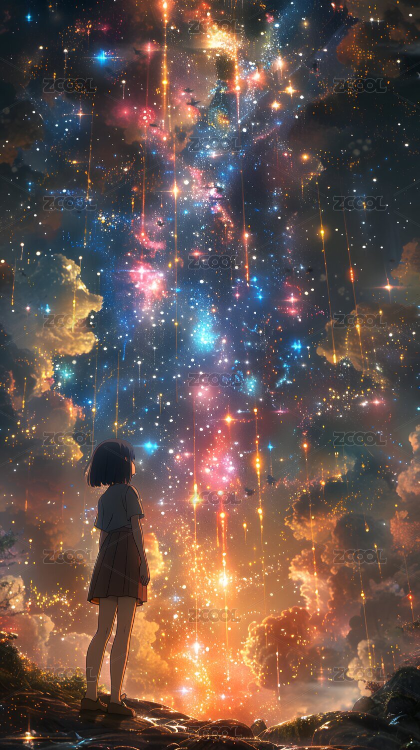 新海诚风格风景浪漫星光坠落日漫卡通插画