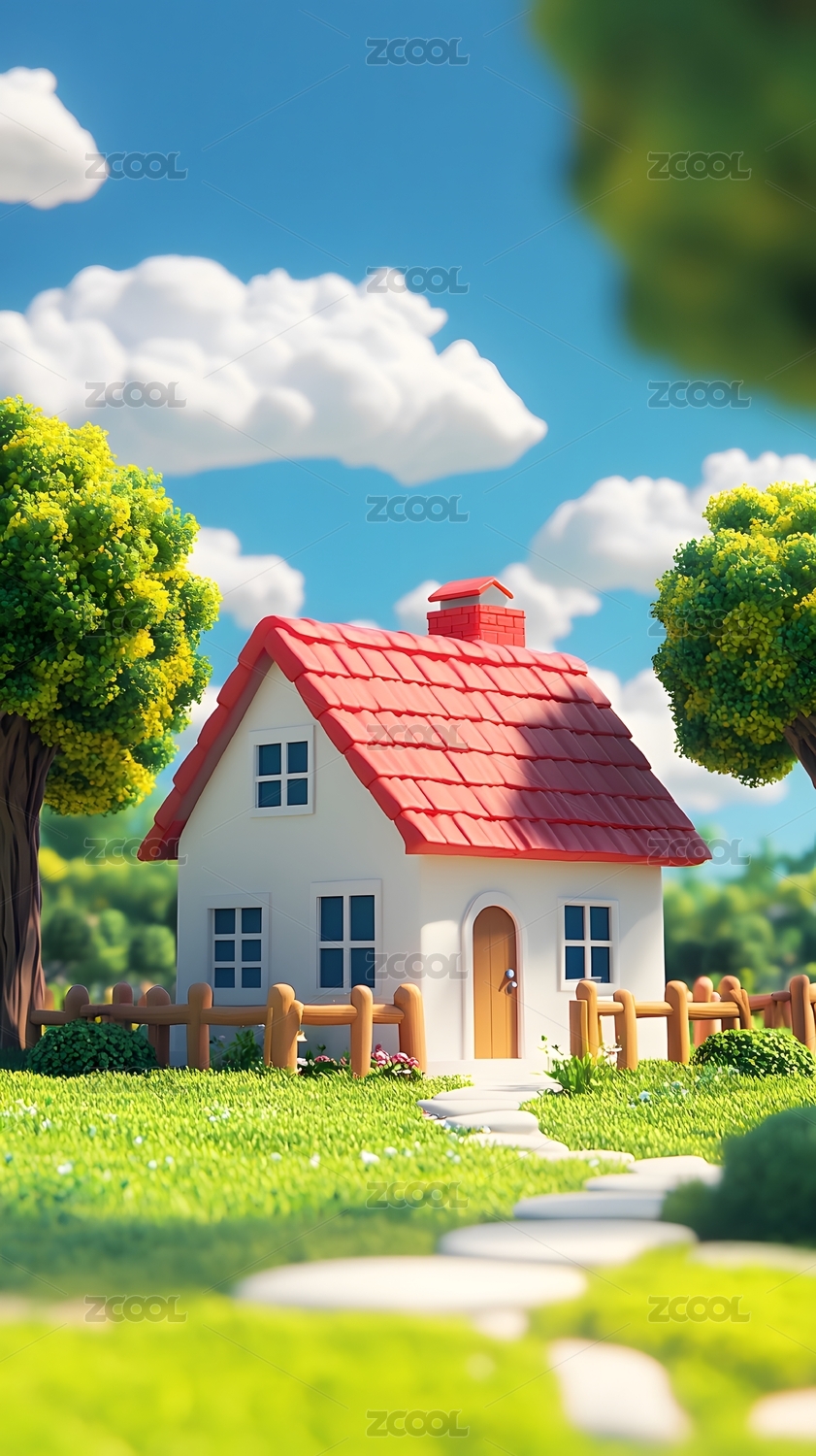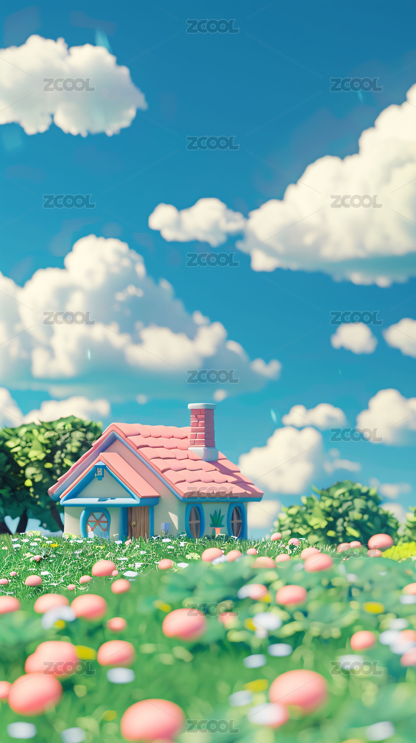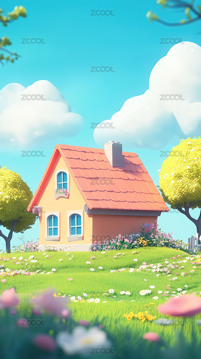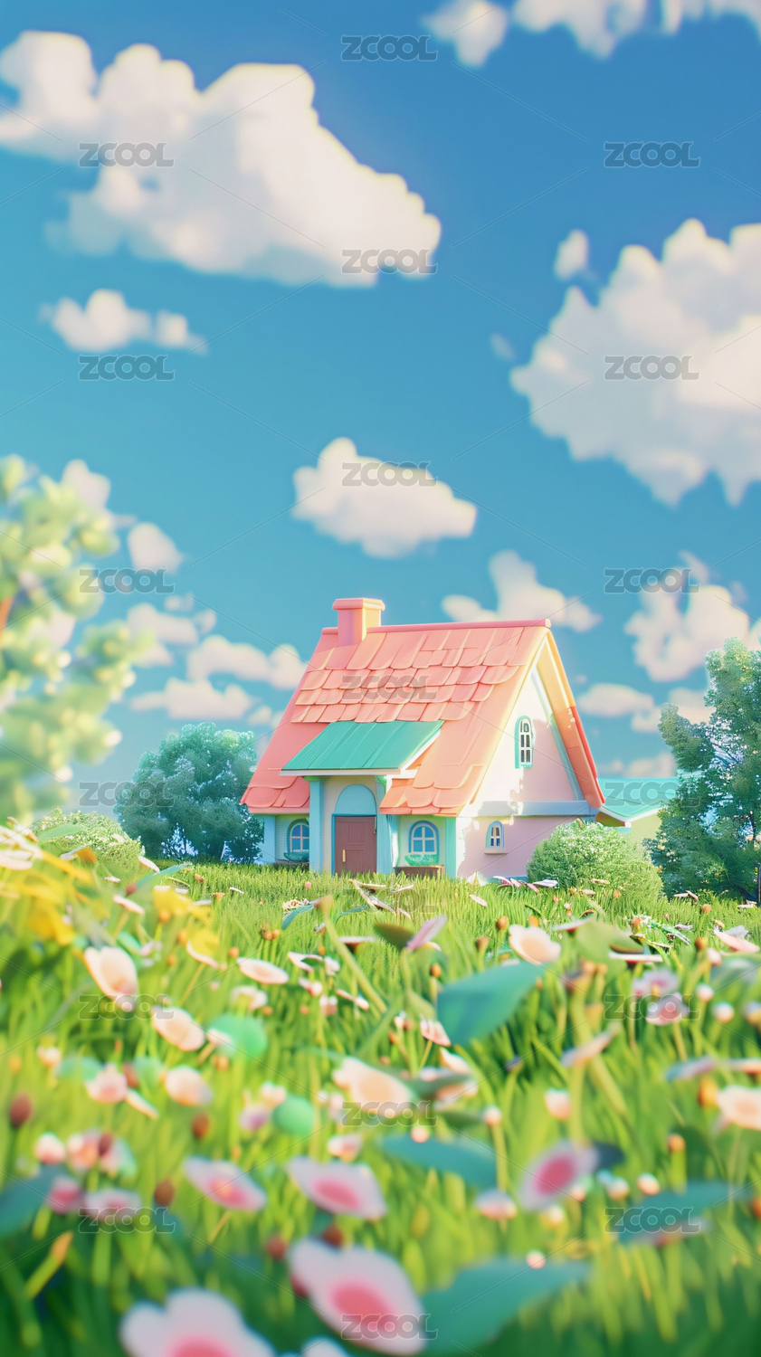 立夏节气户外房屋花草场景夏天旅行3D插画