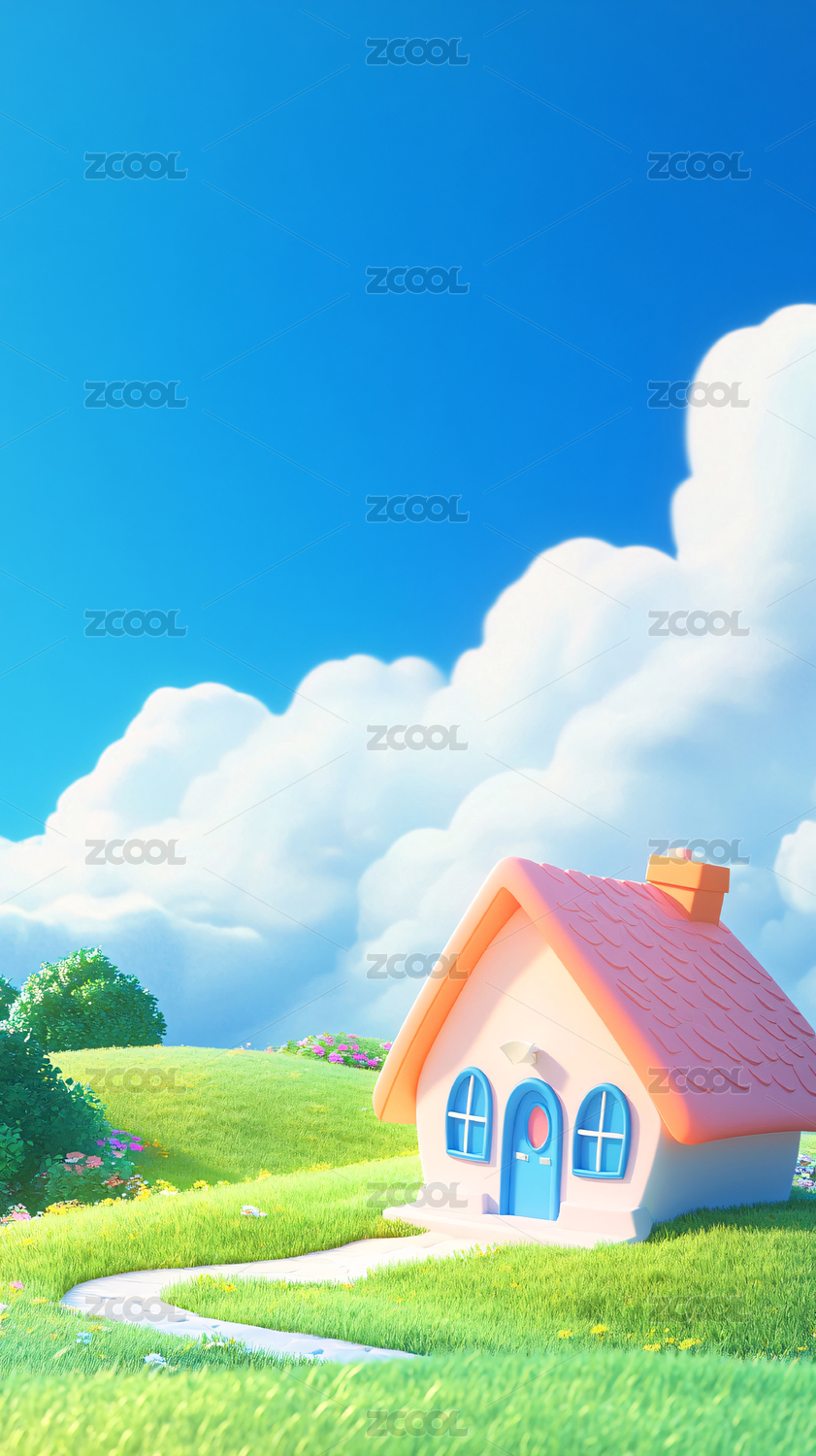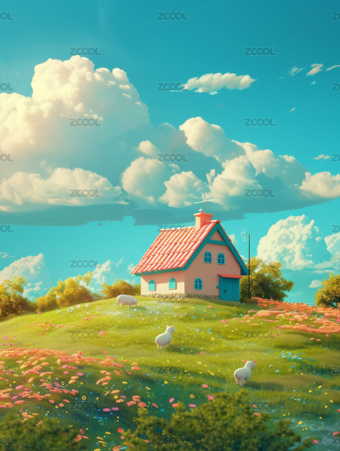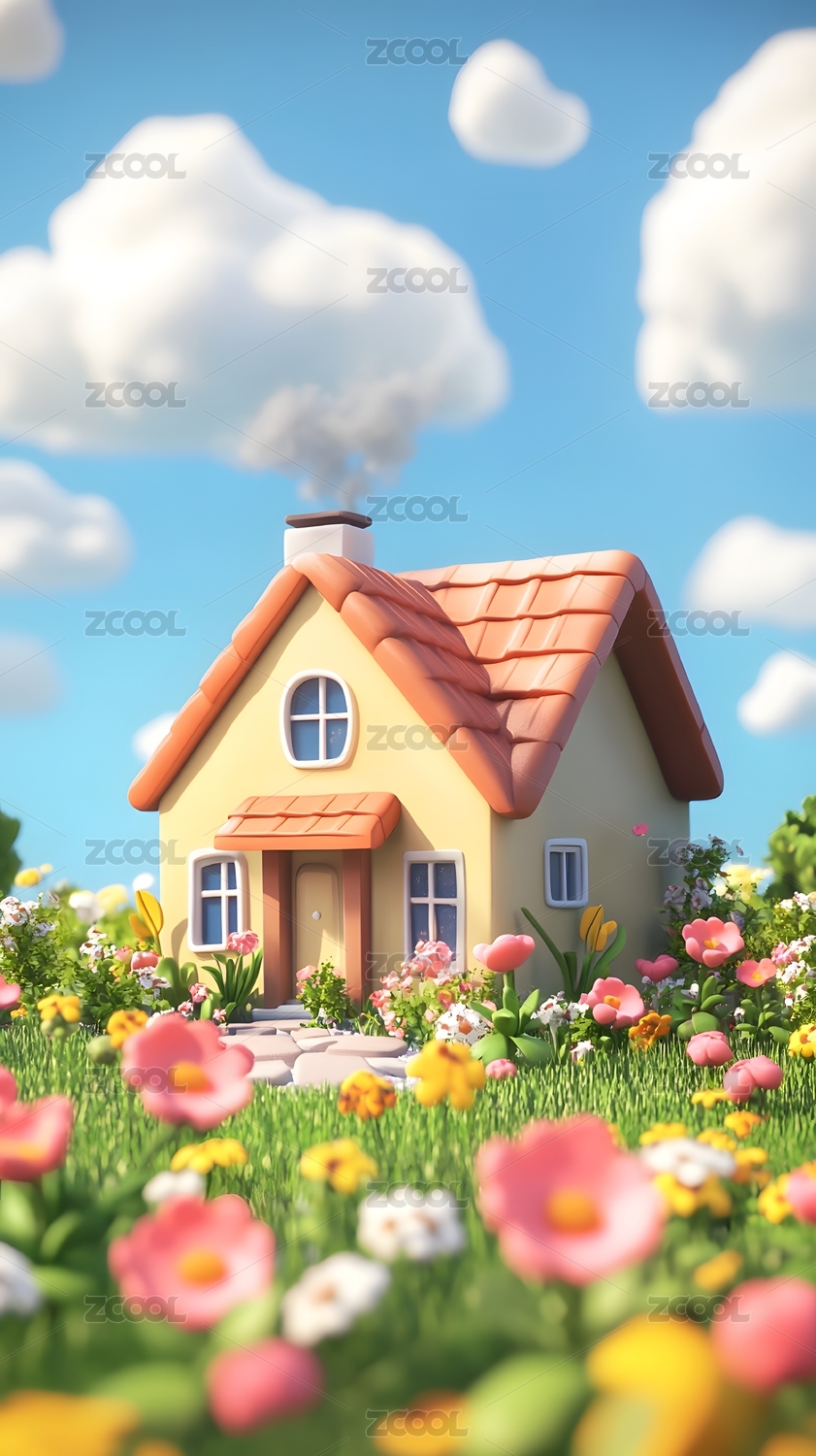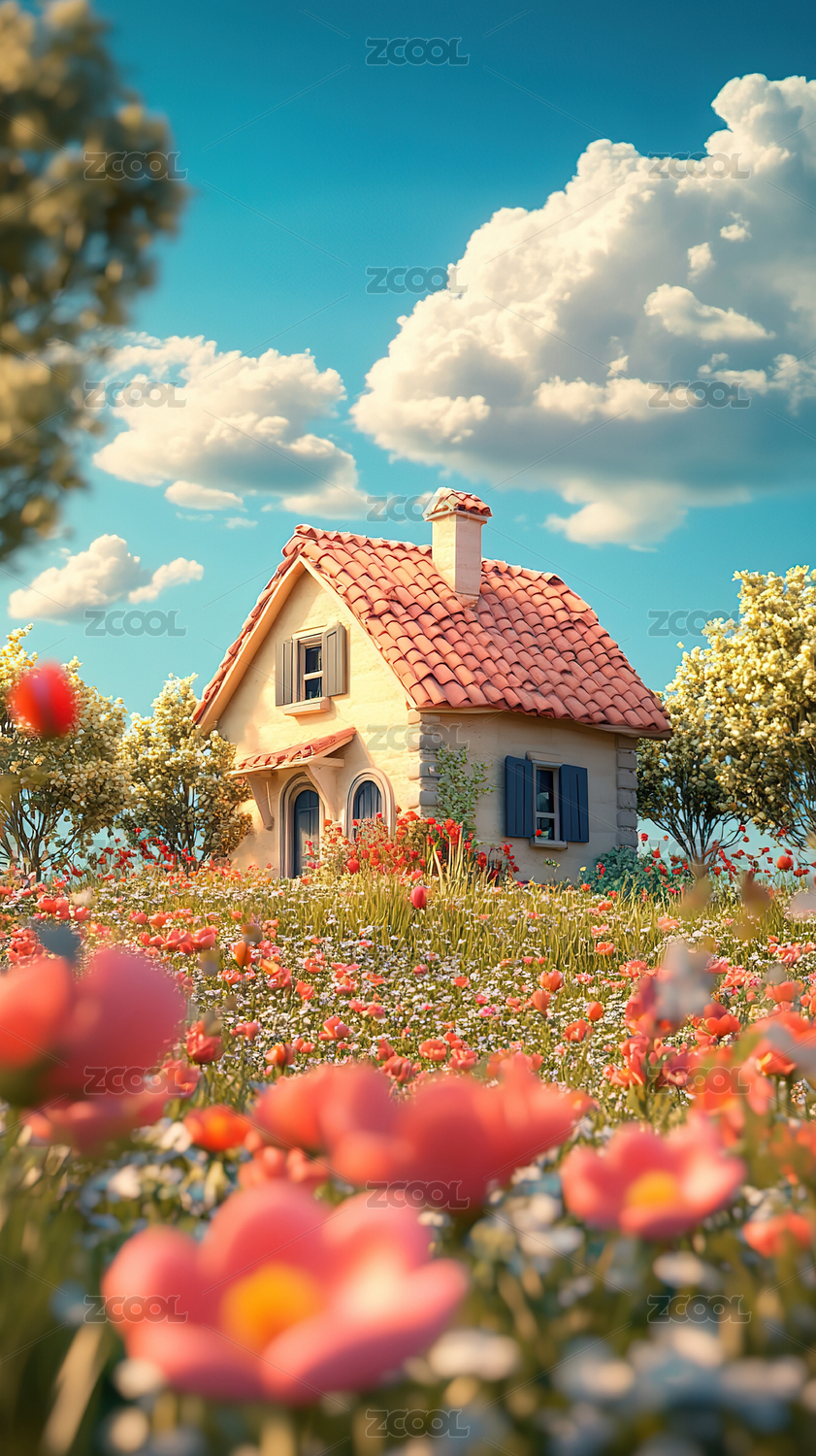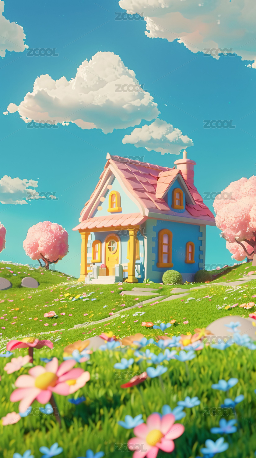立夏节气户外房屋花草场景夏天旅行3D插画