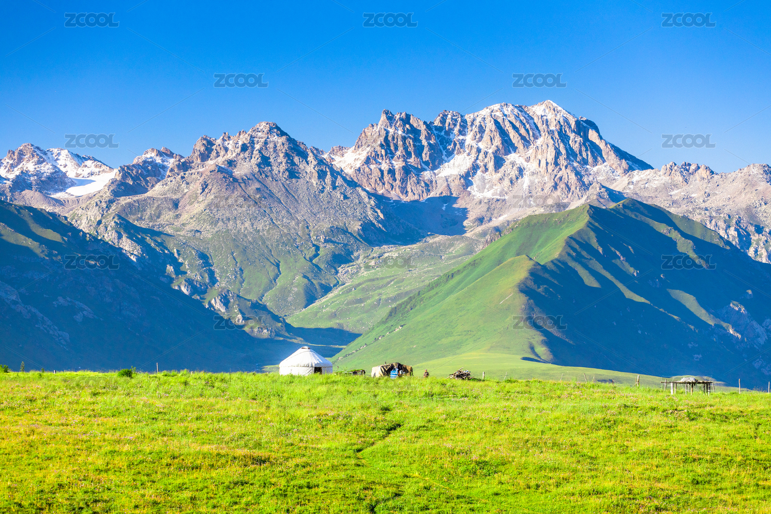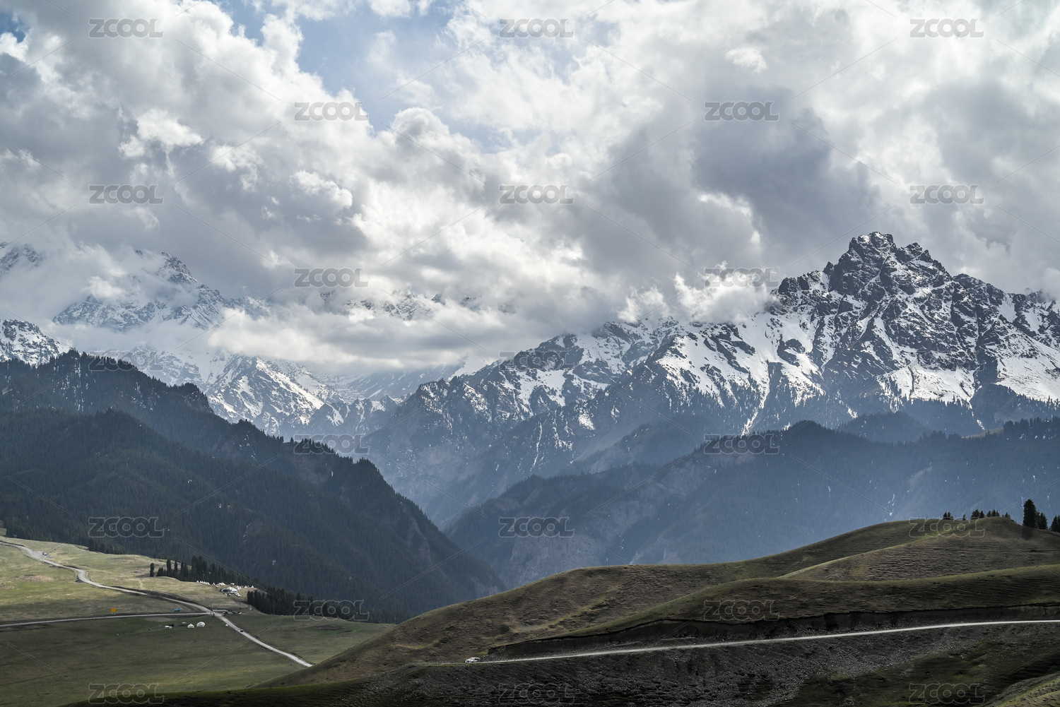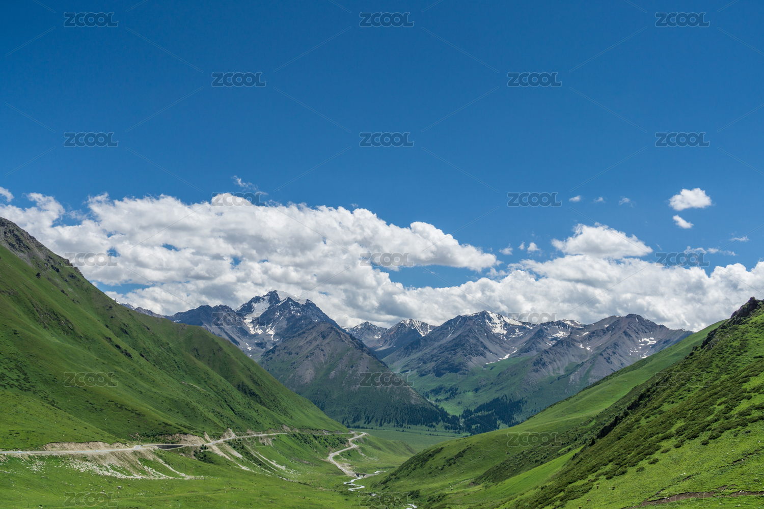 中国新疆夏季蓝天白云下G217独库公路沿途高山草原
