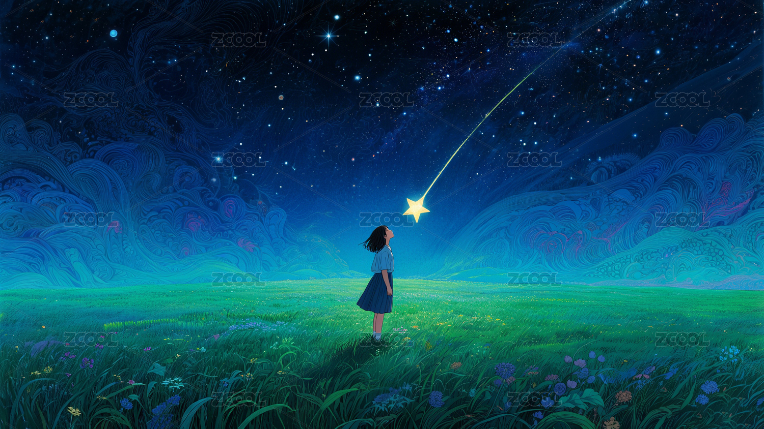草地上仰望星空的小女孩
