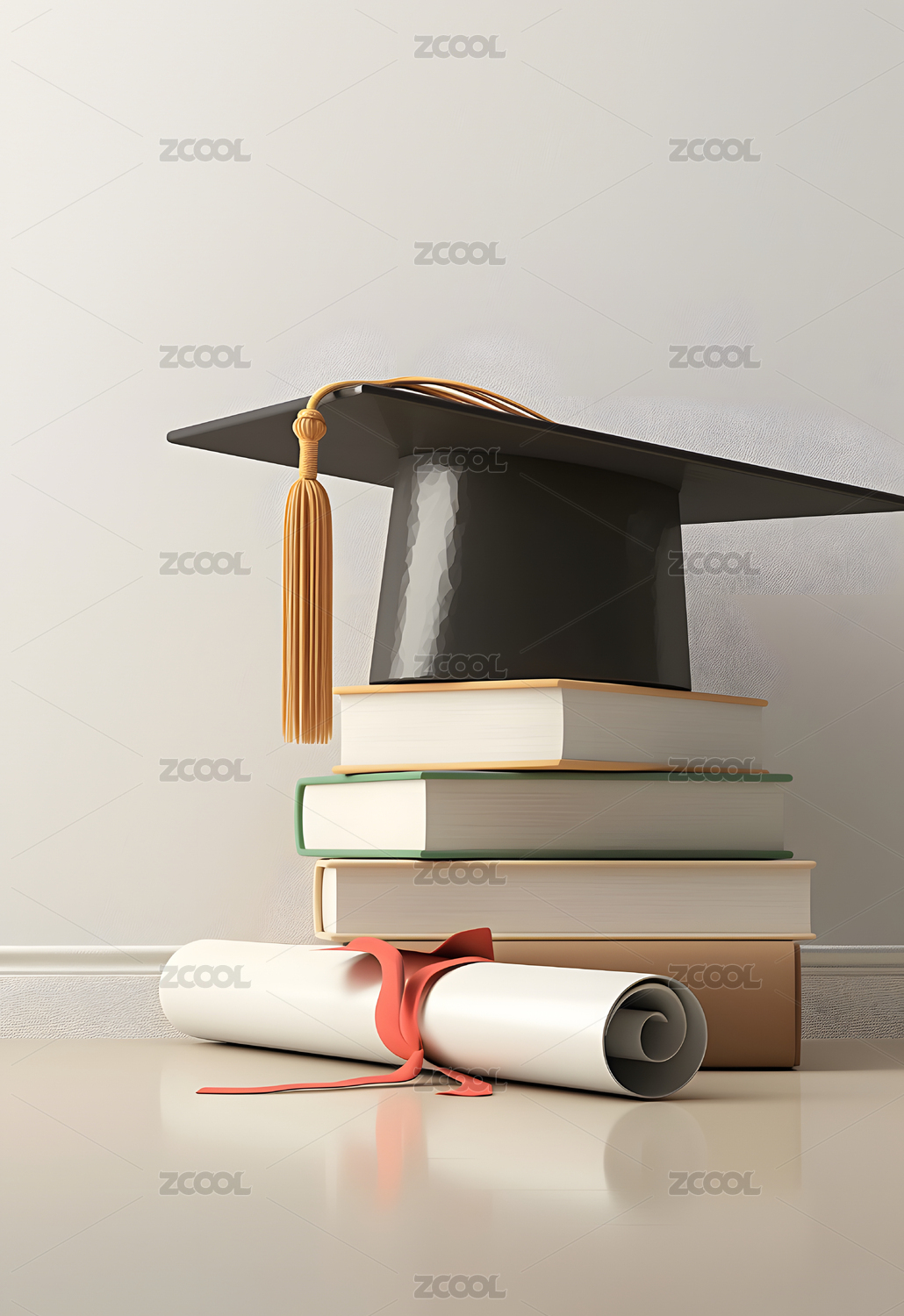 书籍堆叠上的毕业学士帽