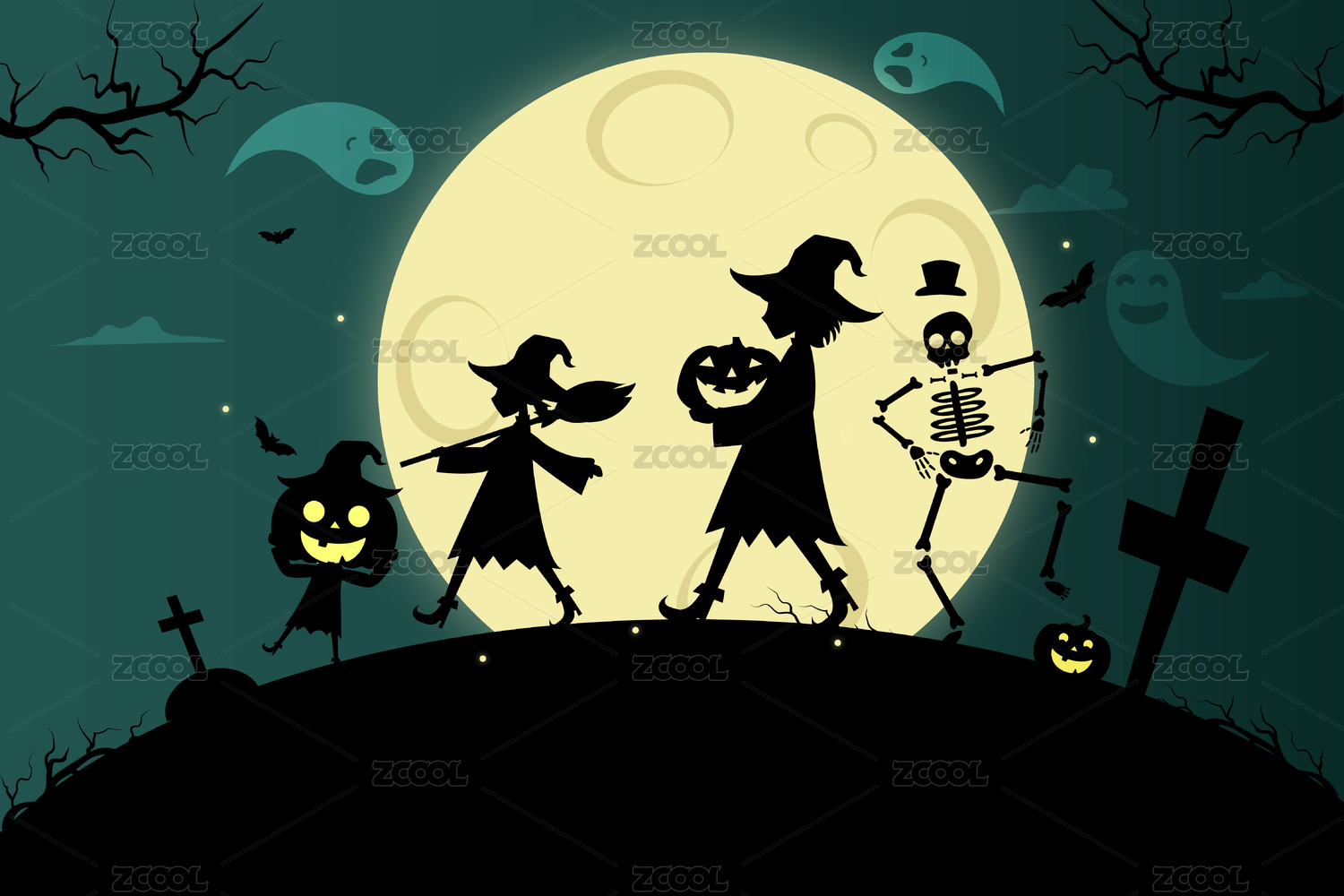 万圣节女巫鬼怪南瓜骷髅留白矢量插画