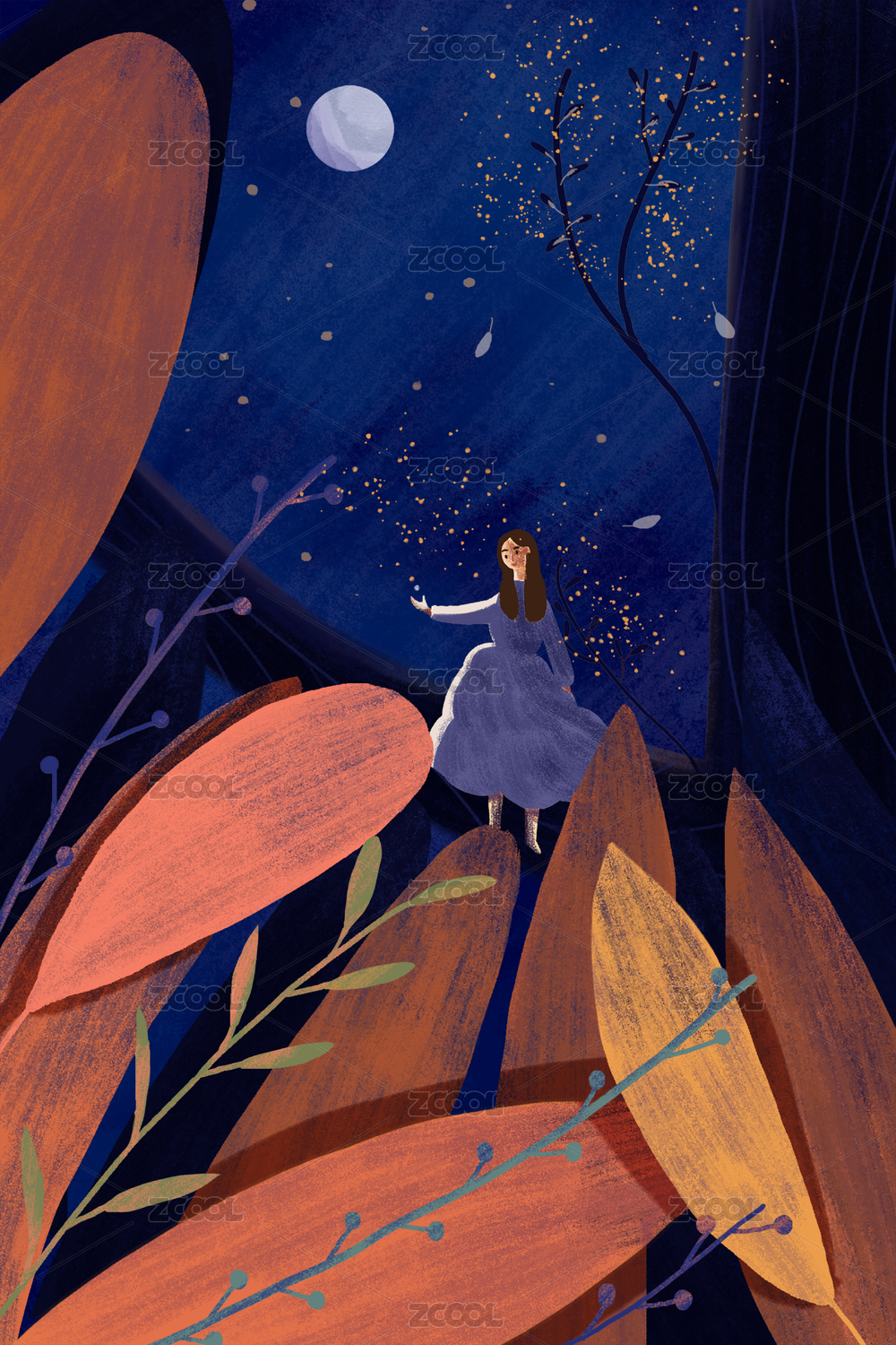 森林户外神秘夜景插画