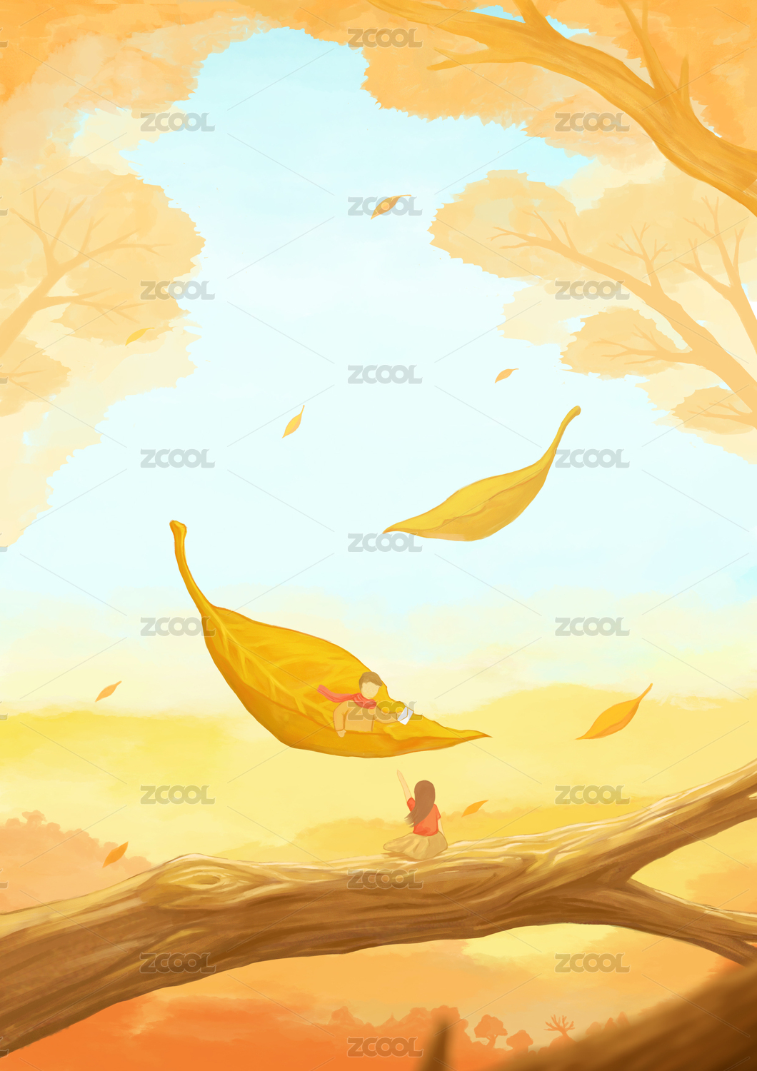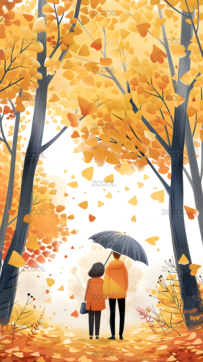 秋季少女与银杏叶插画