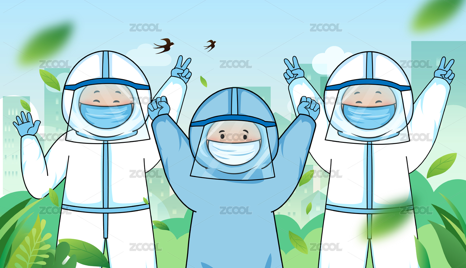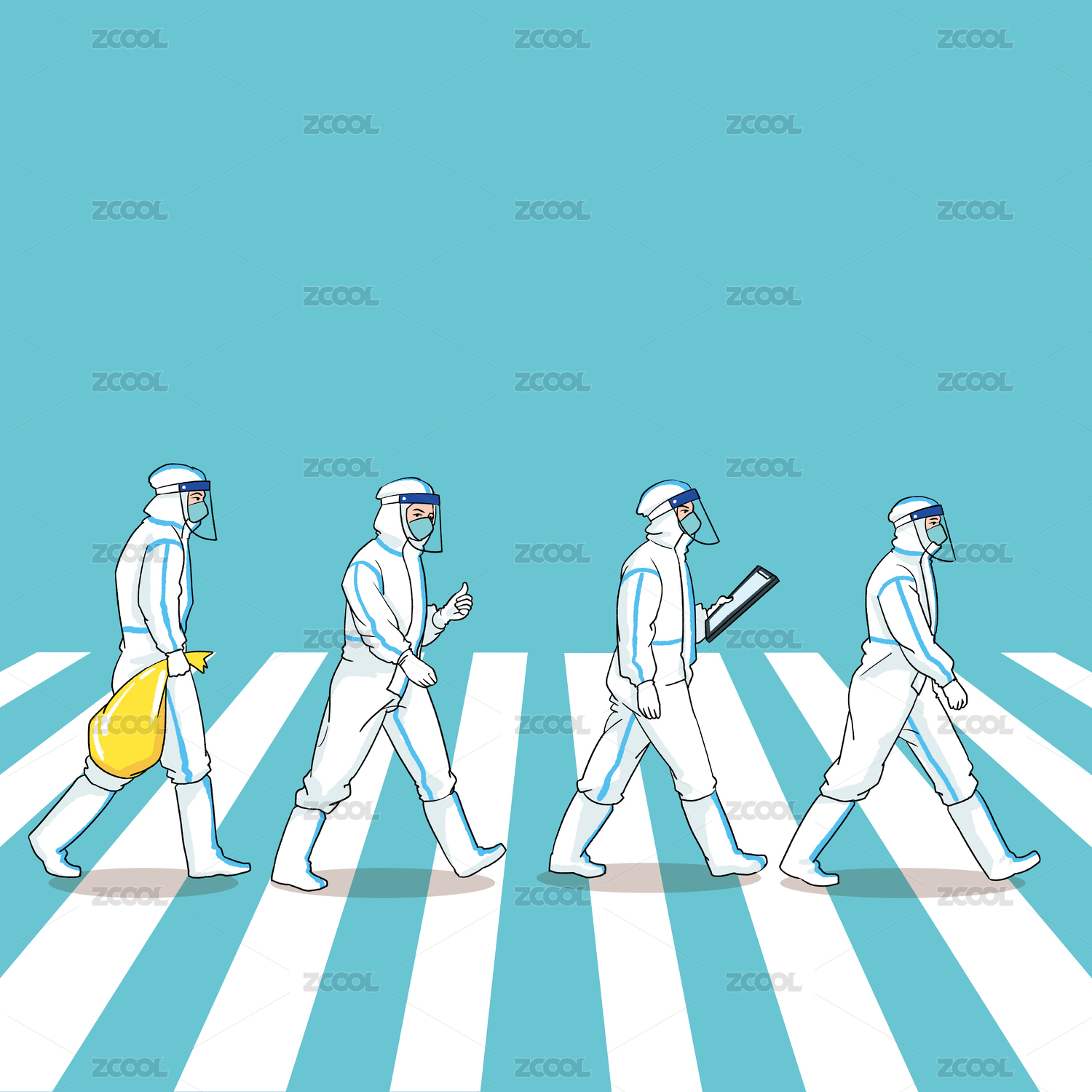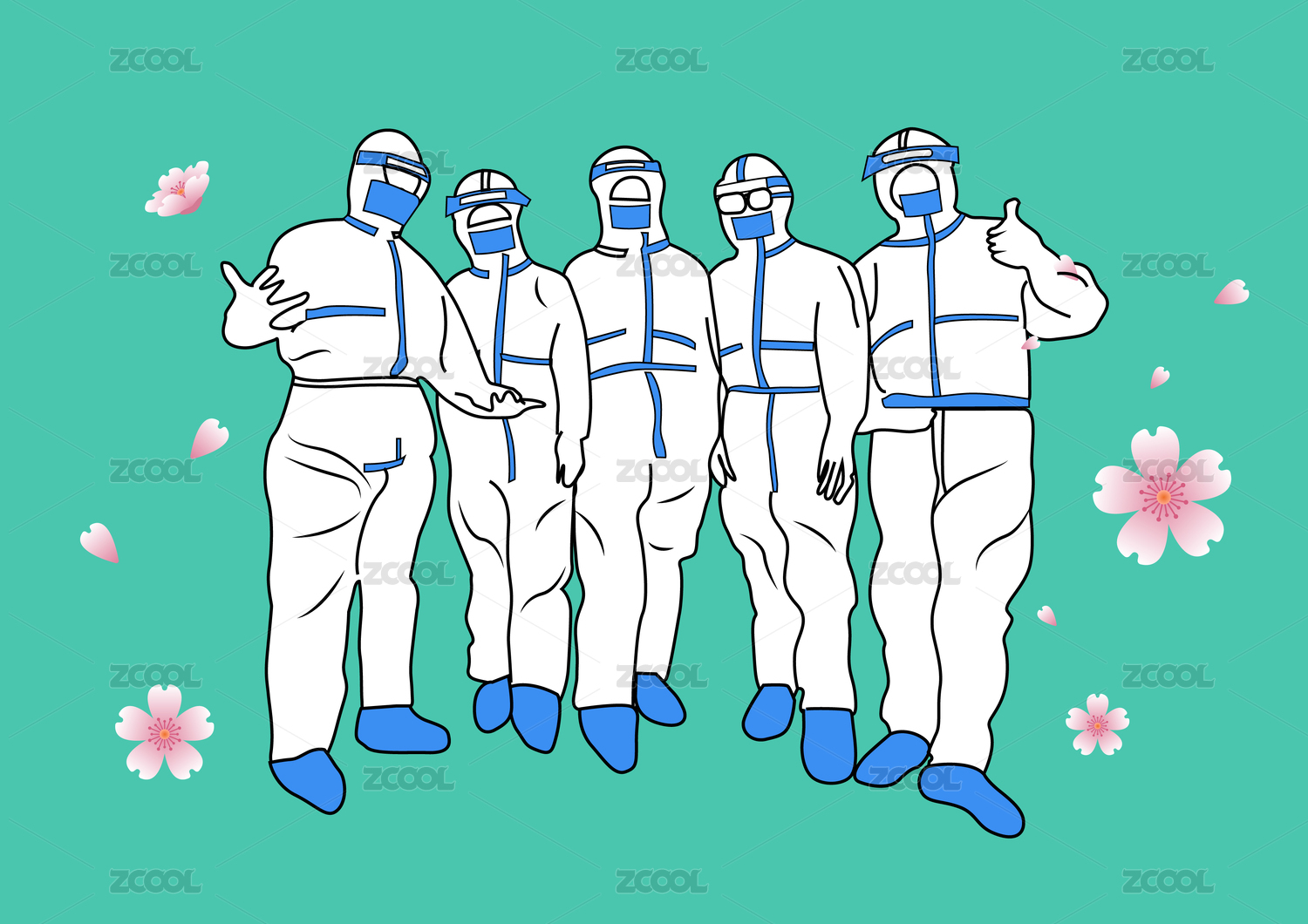 防护服,抗疫,斑马线,马路,医护,花树,樱花,街道,蓝天,白云