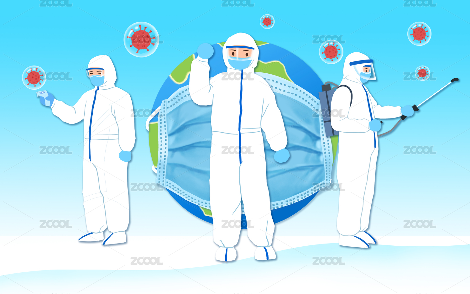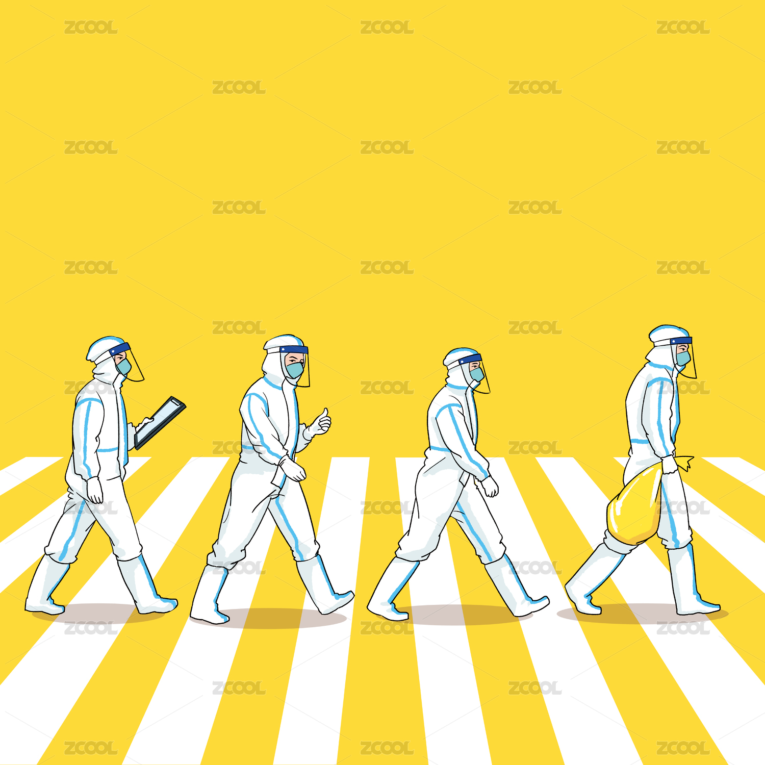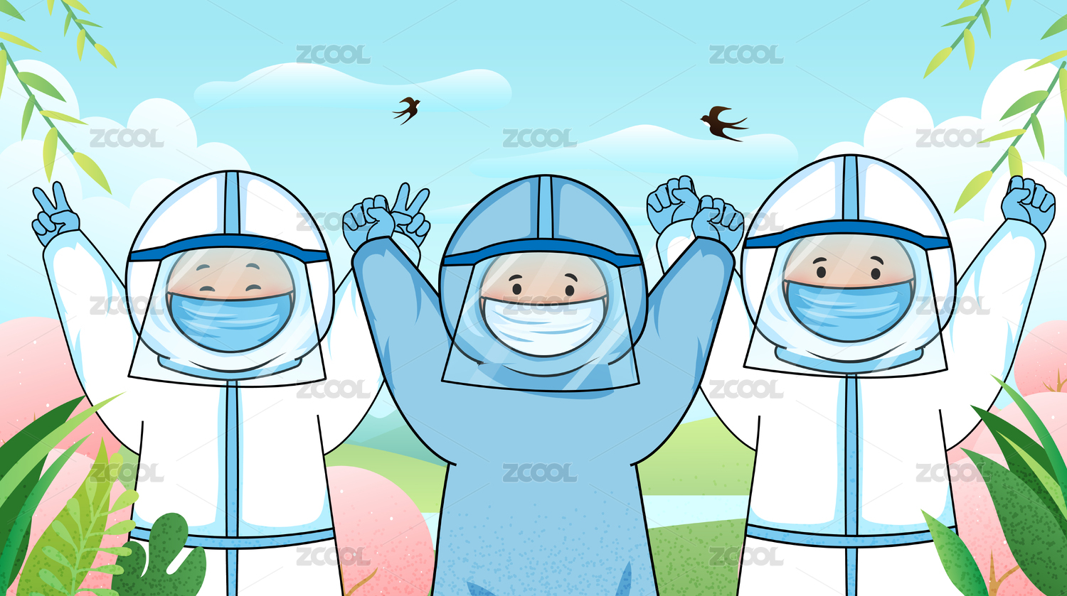 防护服,抗疫,斑马线,马路,医护,花树,樱花,街道,蓝天,白云