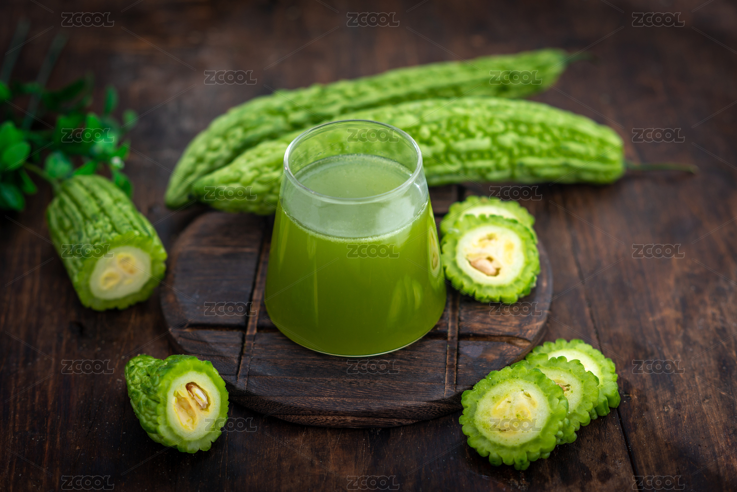 白背景上的苦瓜和苦瓜汁,绿色蔬果图片。