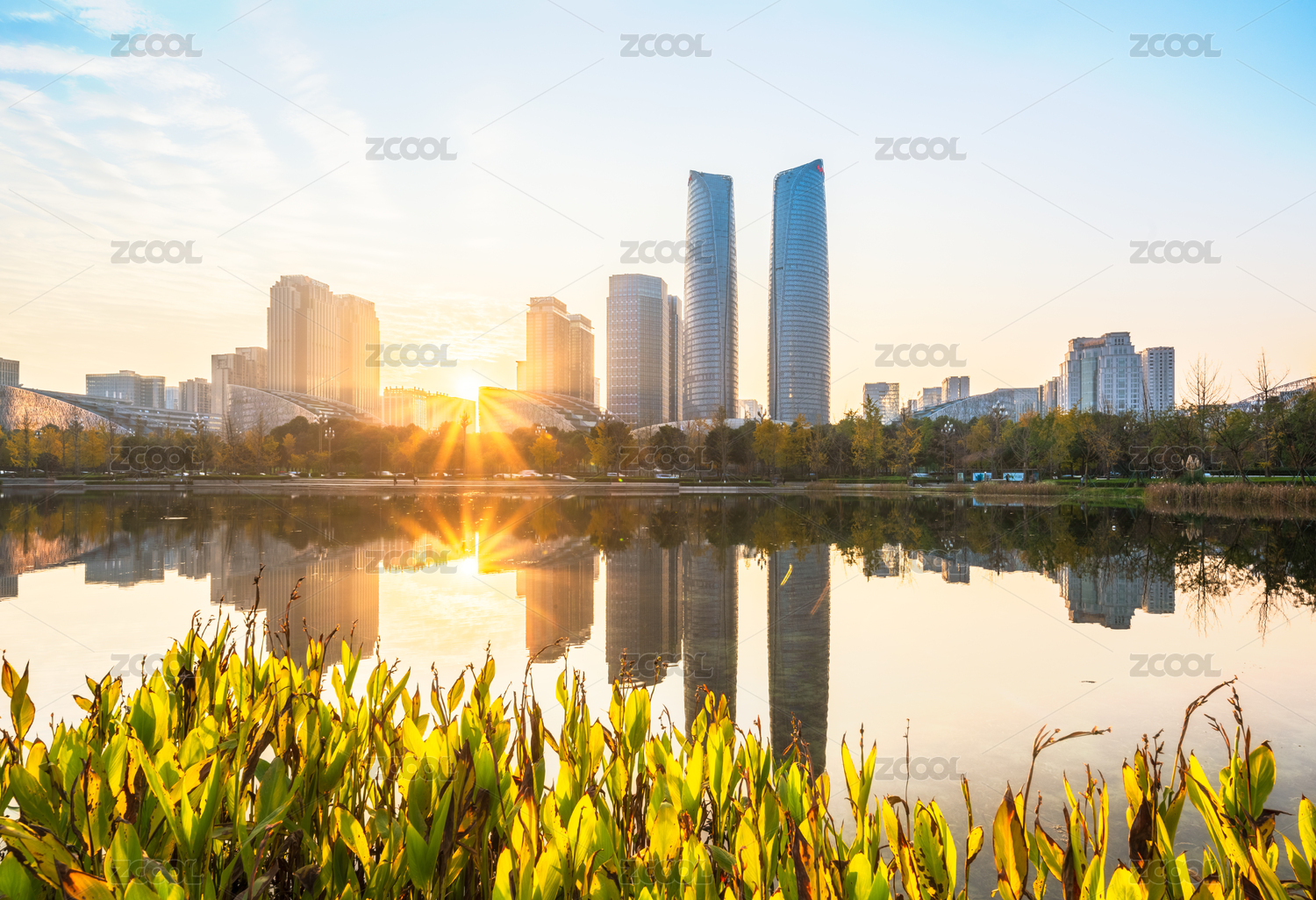 中国四川省成都市金融城交子公园周边现代建筑落日风光