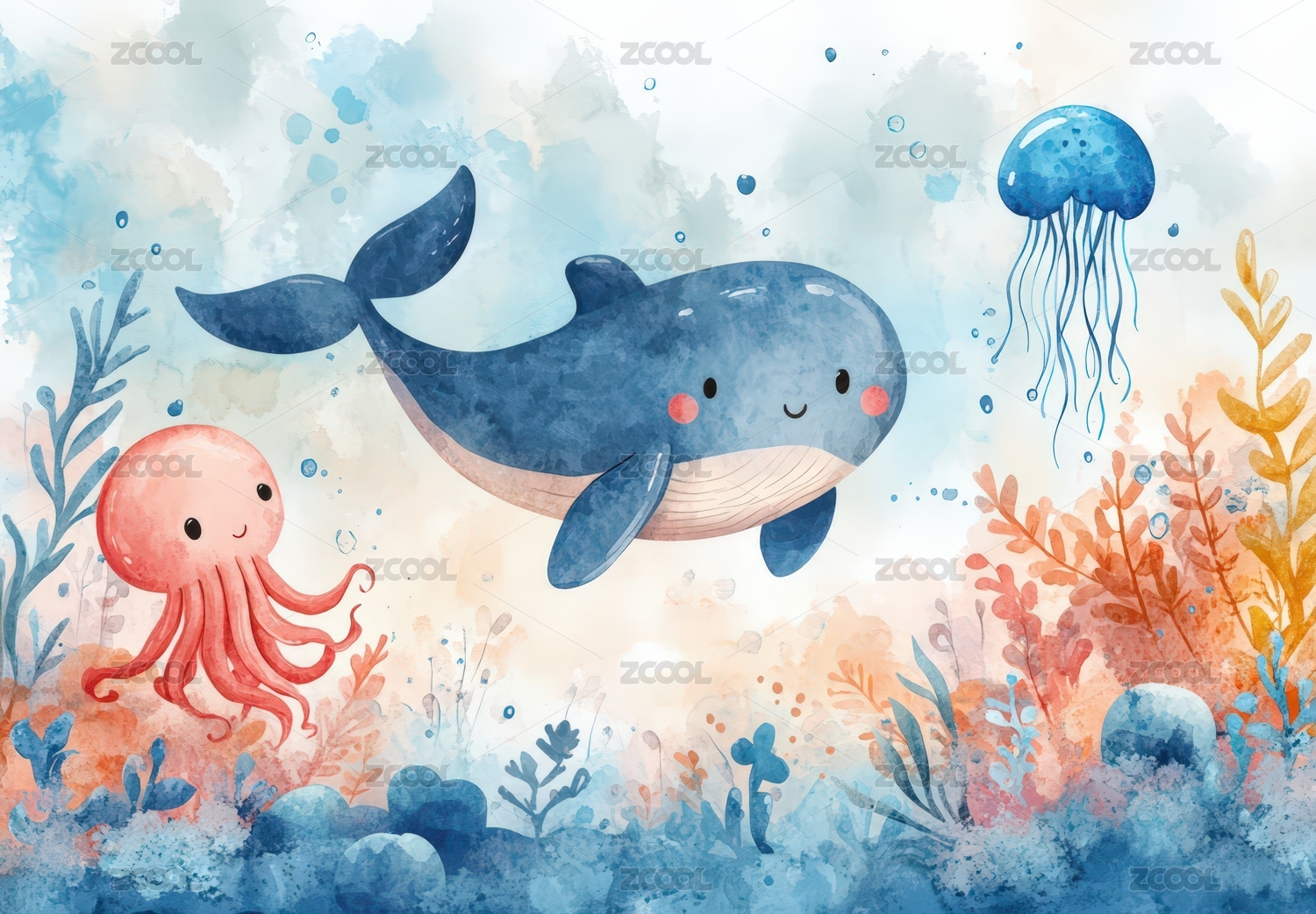蓝色,艺术,装饰,色彩,绘画,海洋,鲸鱼,水彩,卡通