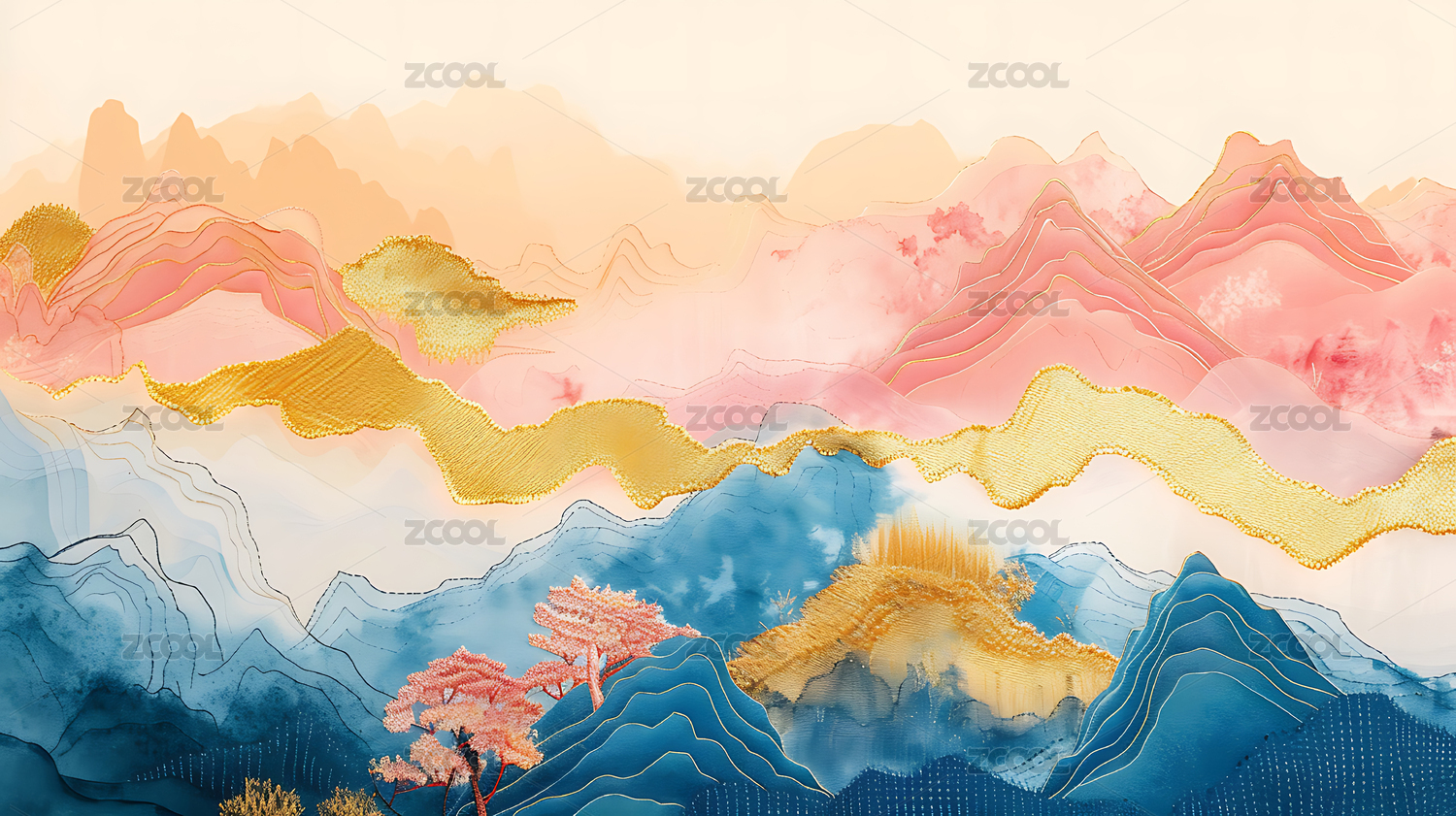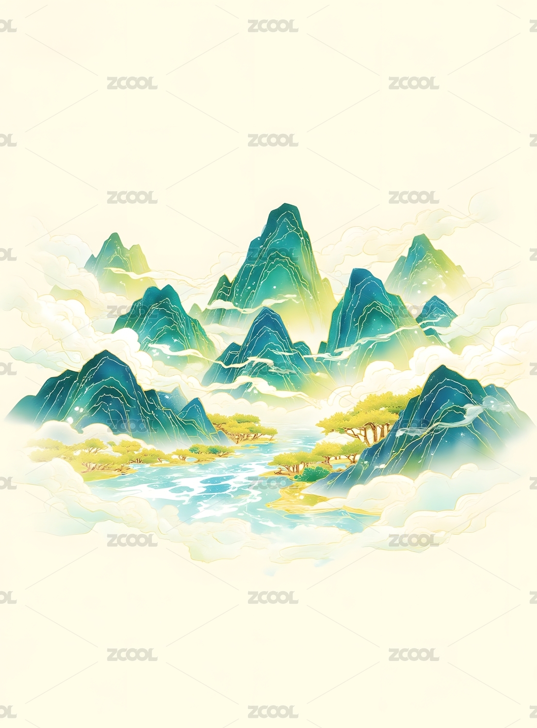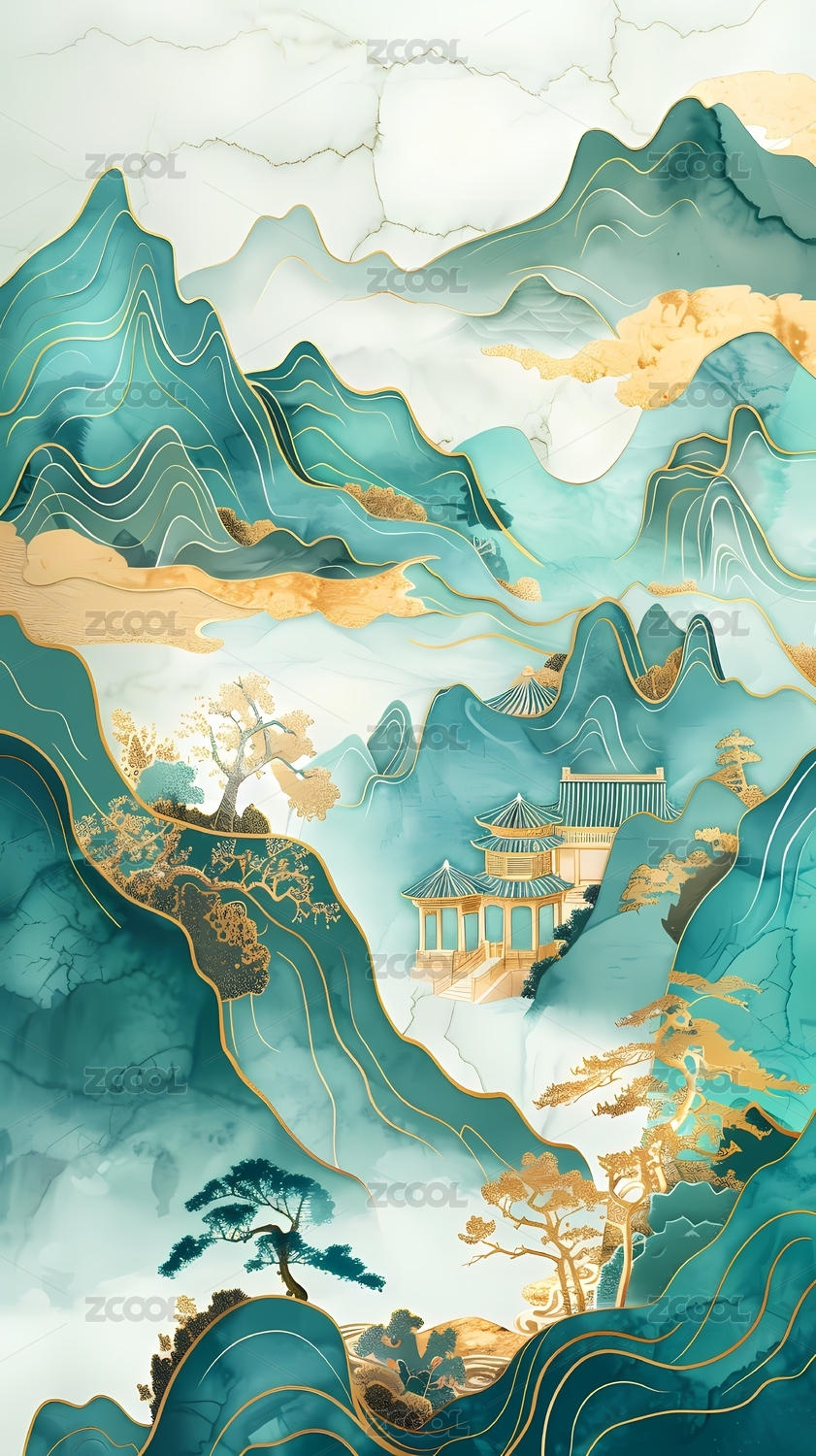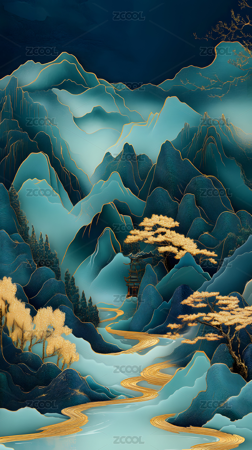 新中式,国风,山水,壁画,3d,梦幻,鎏金,超现实,水彩,水粉