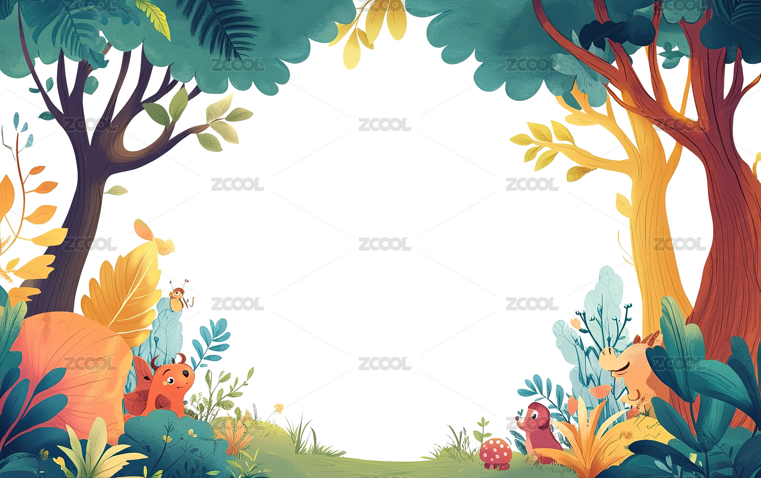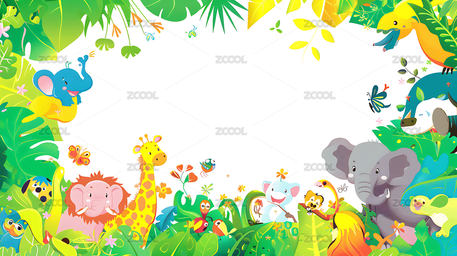 可爱卡通动物绿叶背景边框,儿童卡片明信片