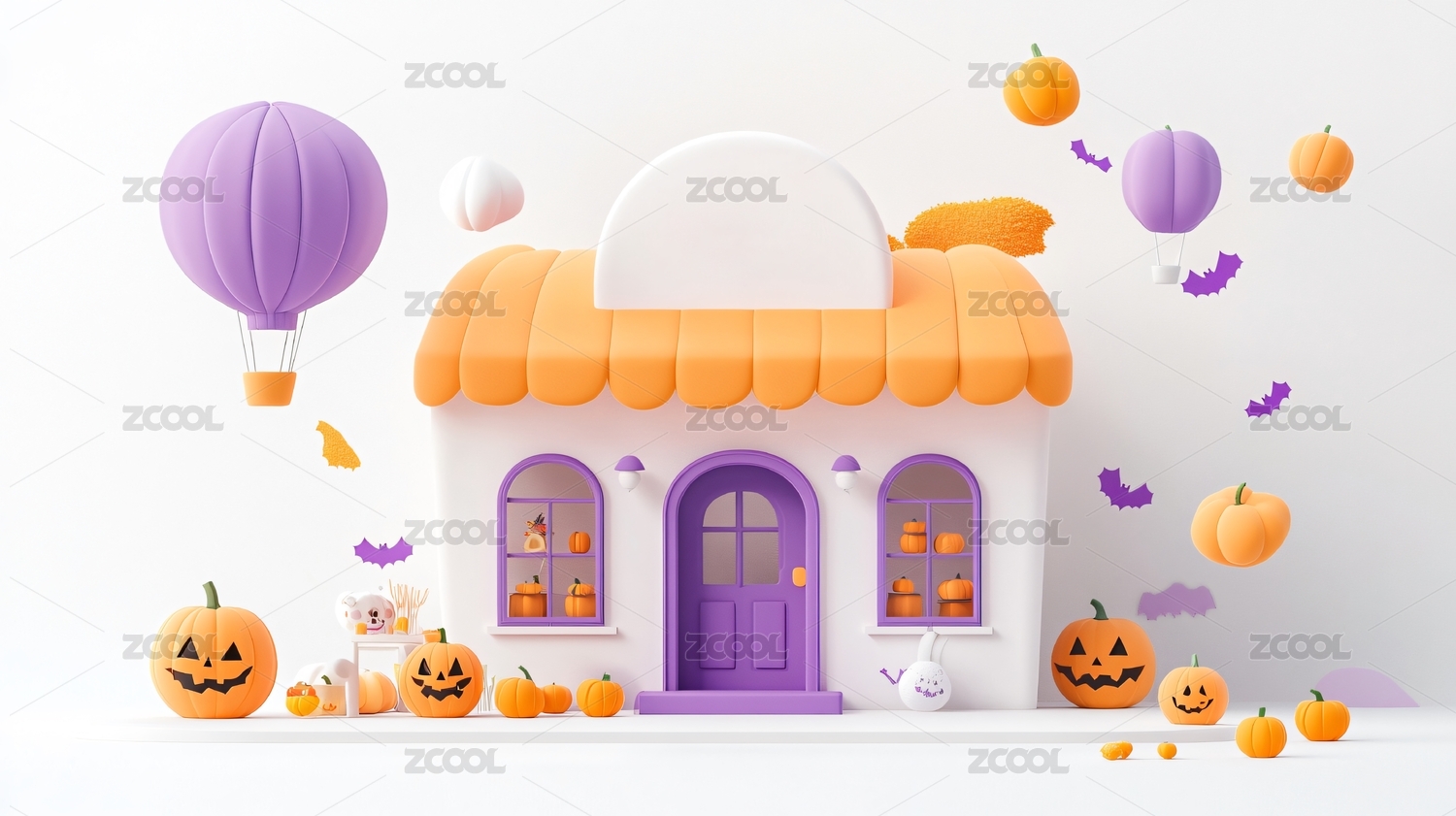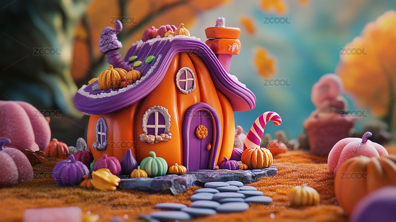 紫色童话小屋南瓜灯幽灵糖果奇幻场景