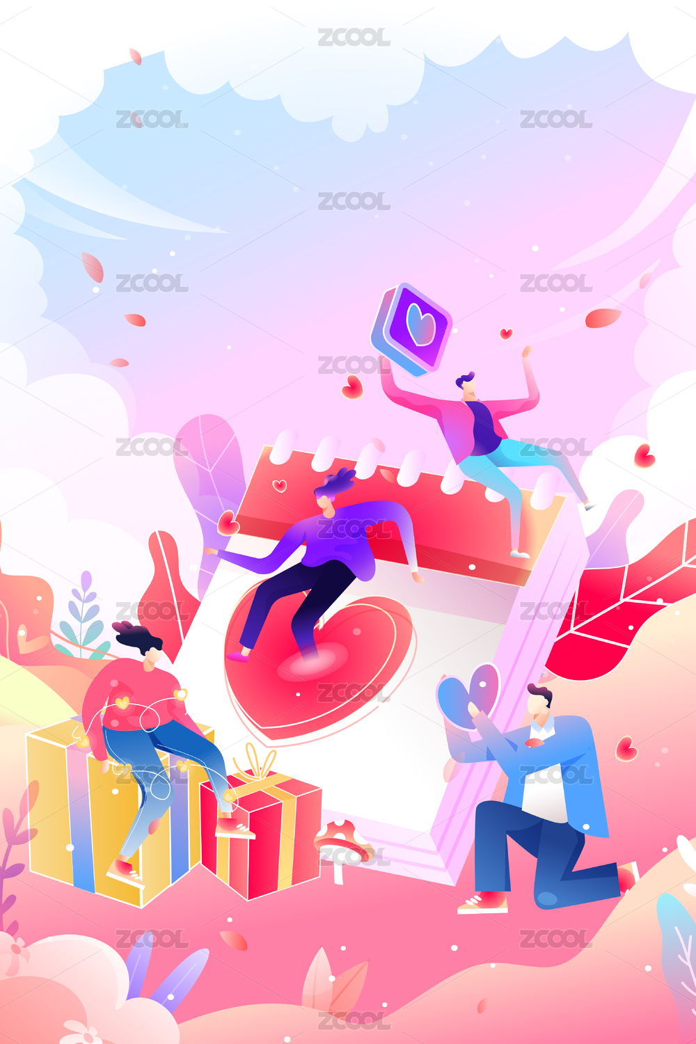 卡通清新白色情人节浪漫情侣背景矢量插画