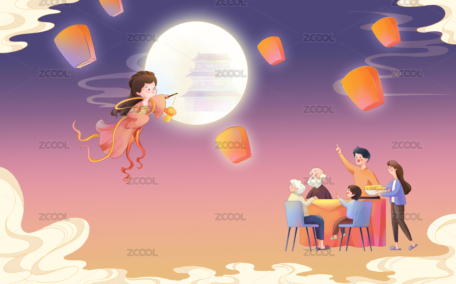 插画,月亮,节日,中秋节,中秋,国风,皎月,放灯,灯笼,祥云