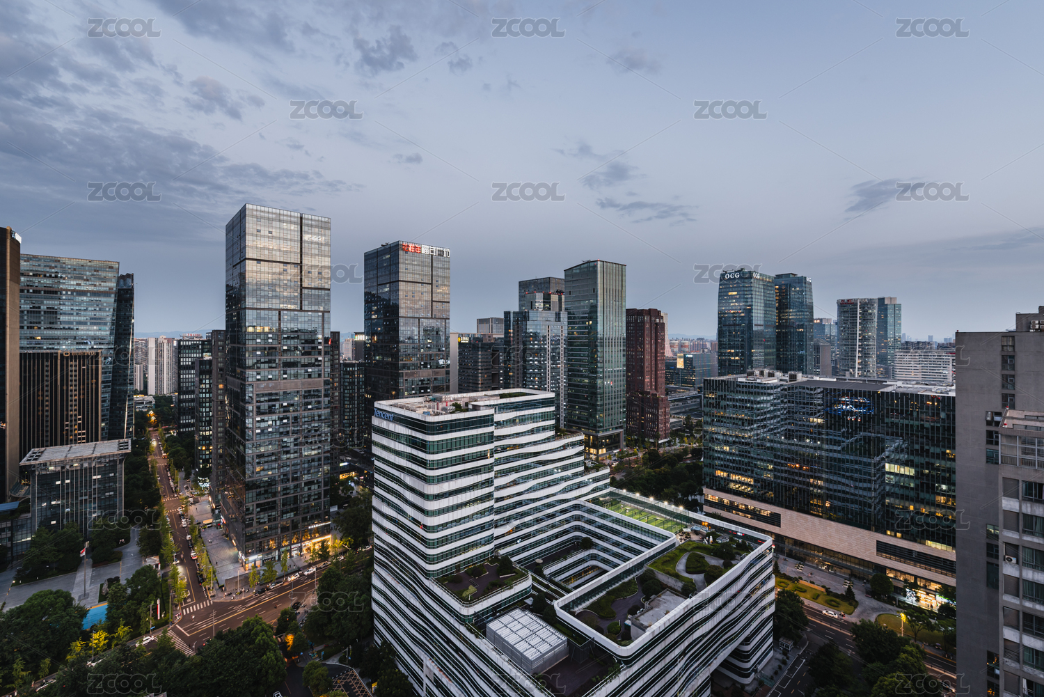 中国四川省成都市高新区金融城周边现代建筑夜景航拍图