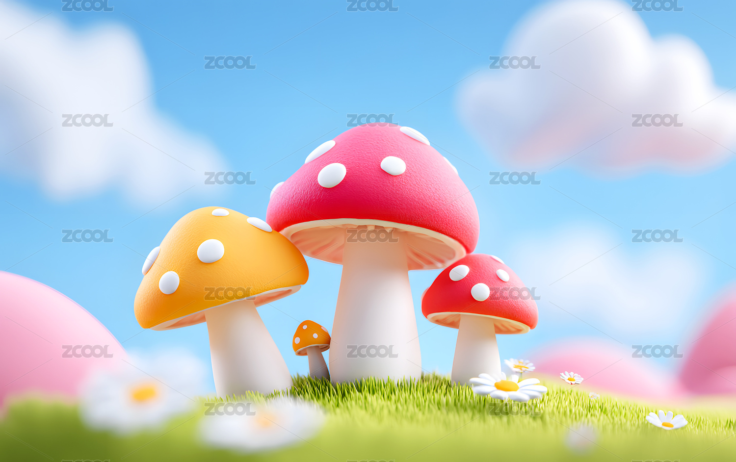 草地上可爱的蘑菇梦幻童话3D插画