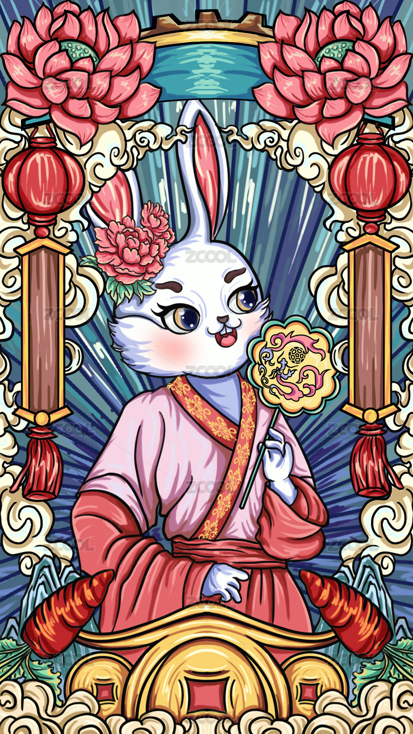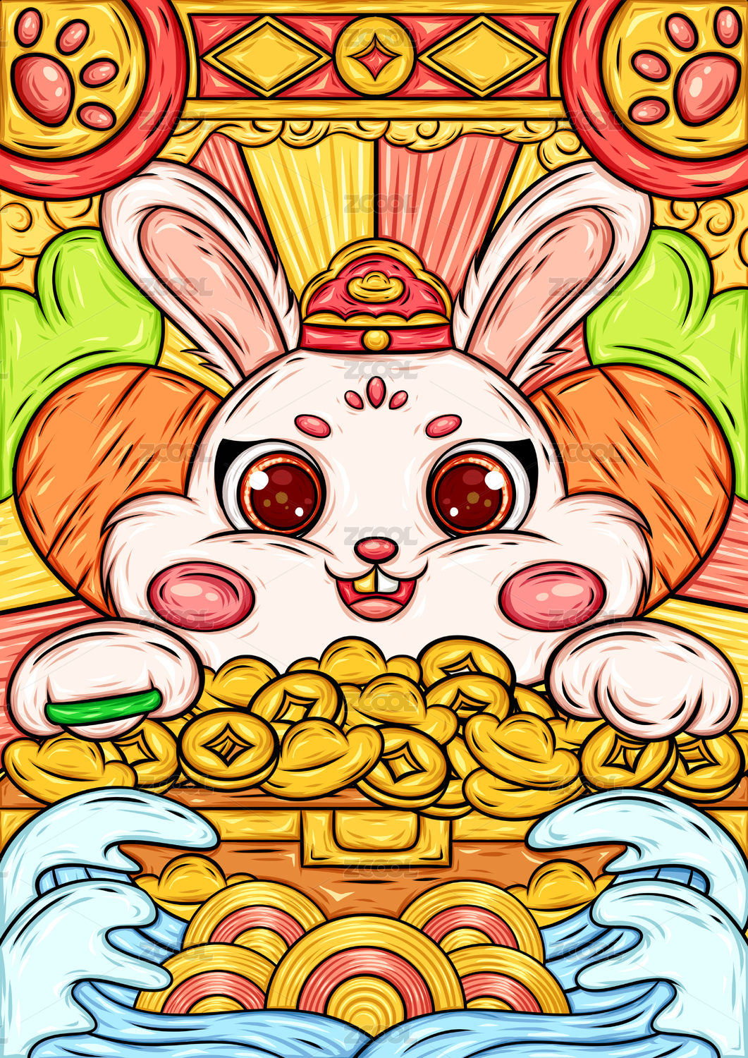兔年贺岁国潮插画兔子拟人贵妃送财