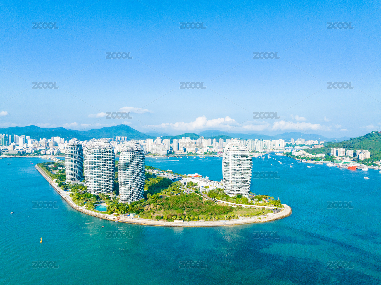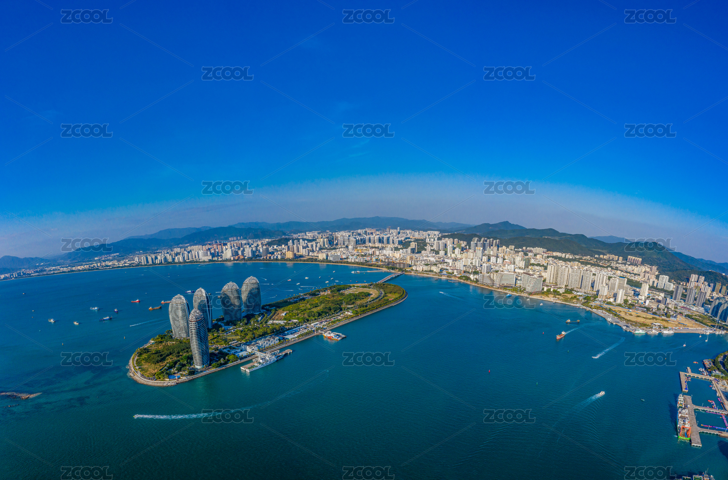 航拍海南三亚凤凰岛热带海滨人工岛度假天堂