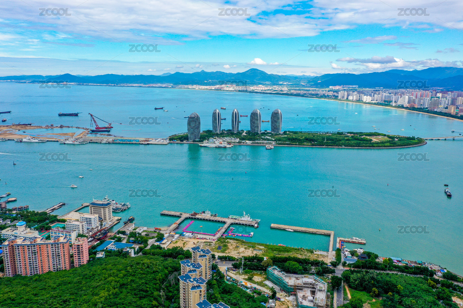 Aerial View of Cruise Home Port and Luxury Hotels on Phoenix Island, Landmark Architecture of Sanya City, Hainan Province, China