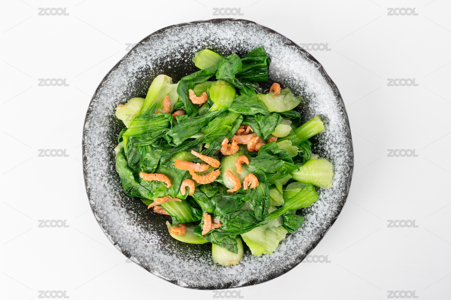 一盘西蓝花炒虾仁摆放在桌面上特写