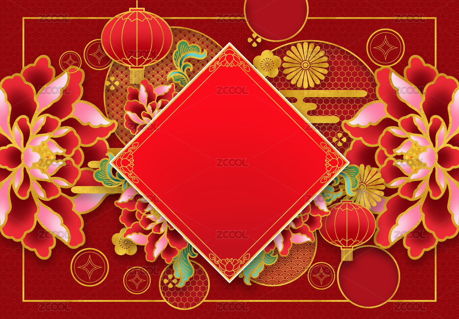 红色,金色,烫金,喜庆,牡丹花,团花锦簇,春节,元旦,新年,节日