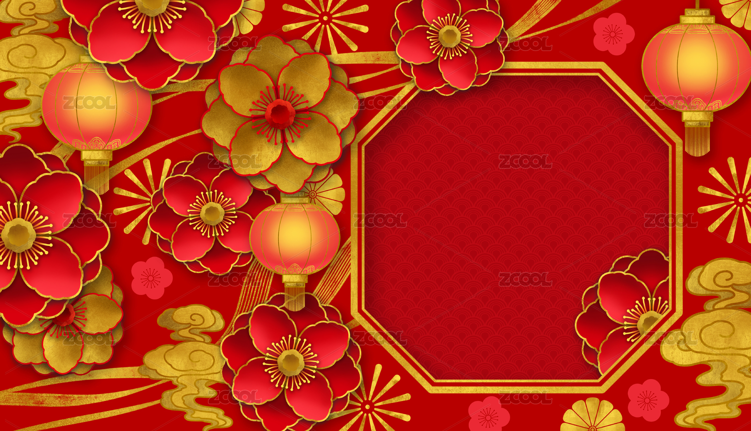 中国风红金色喜庆新年花卉灯笼祥云底纹海报