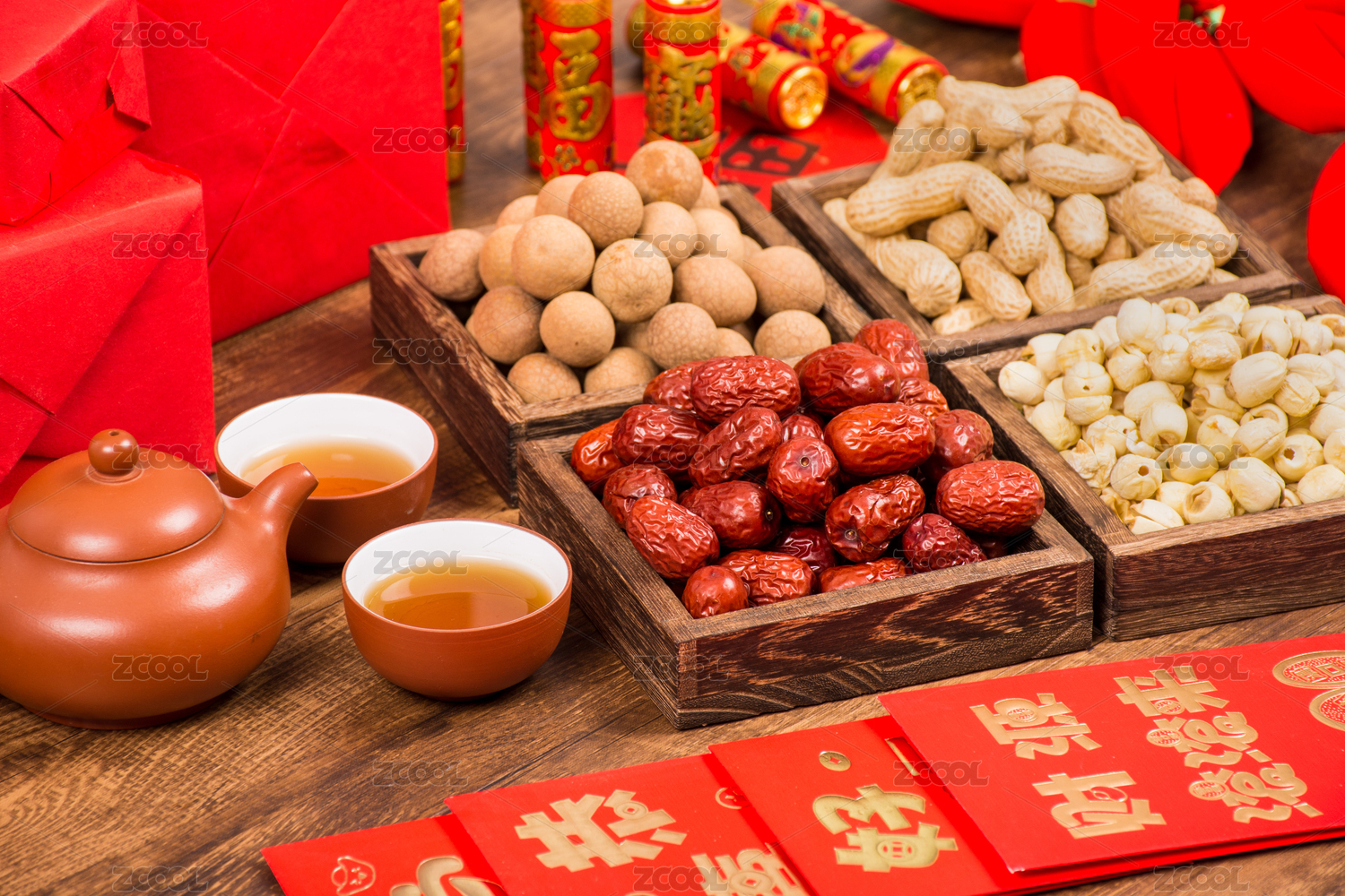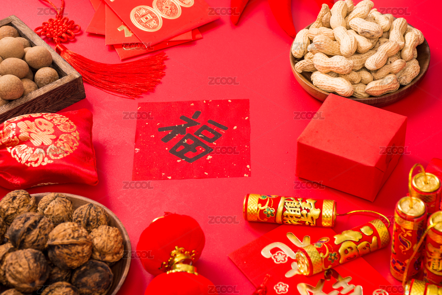 低角度拍摄中国春节红色背景下的各类坚果年货
