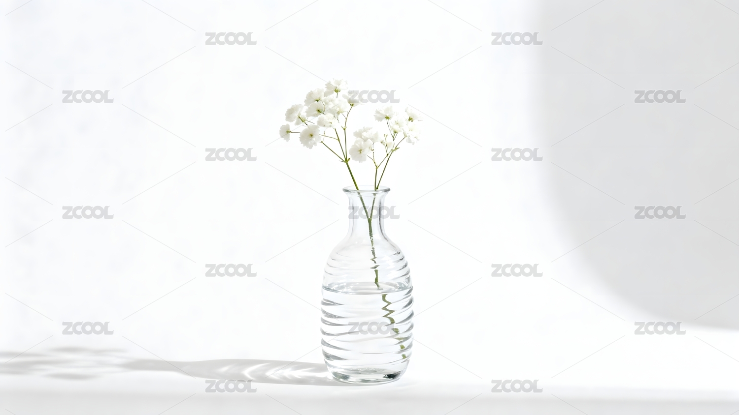 透明花瓶插着白色小花静置桌面