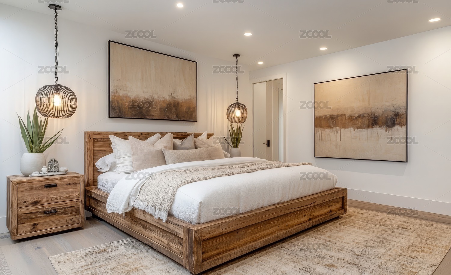 卧室,设计,极简,简约,现代,木质,床,灯具,装饰画,蒲草
