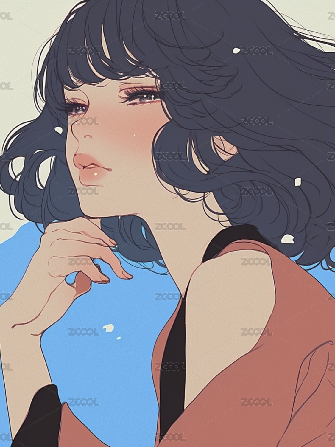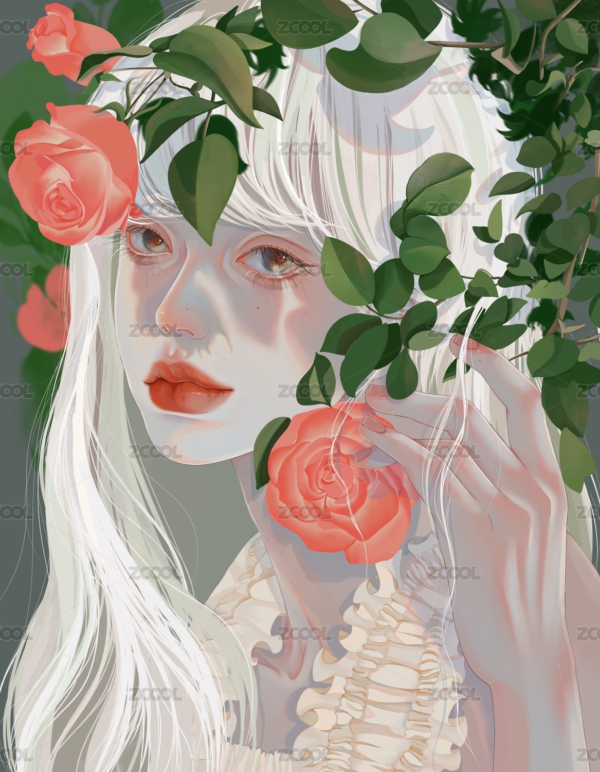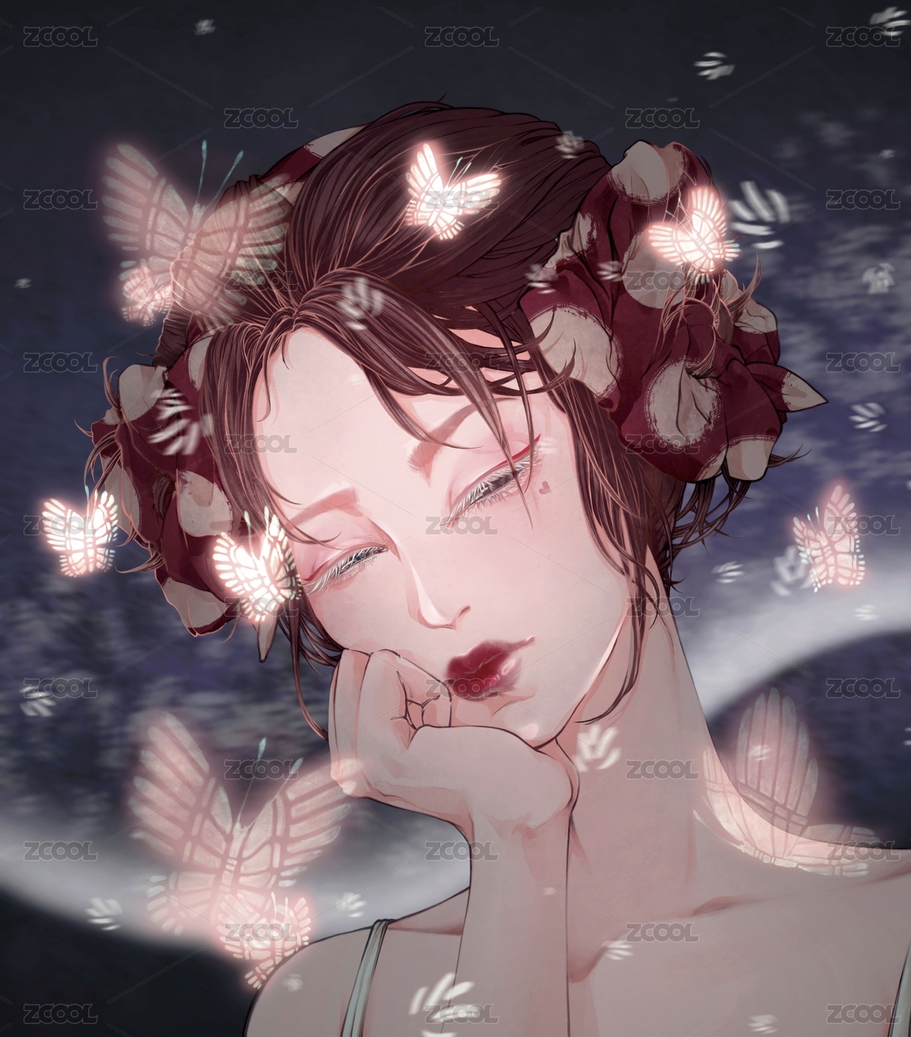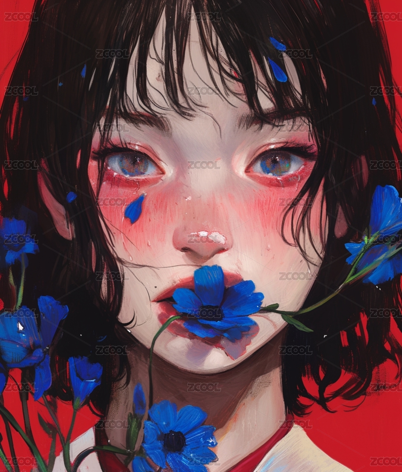 蓝色花朵下的少女红背景唯美悲伤插画油画