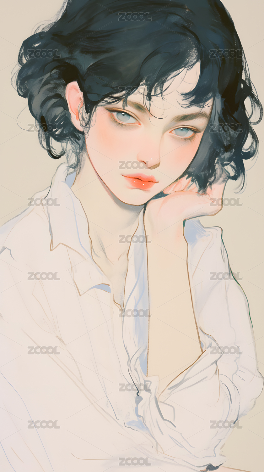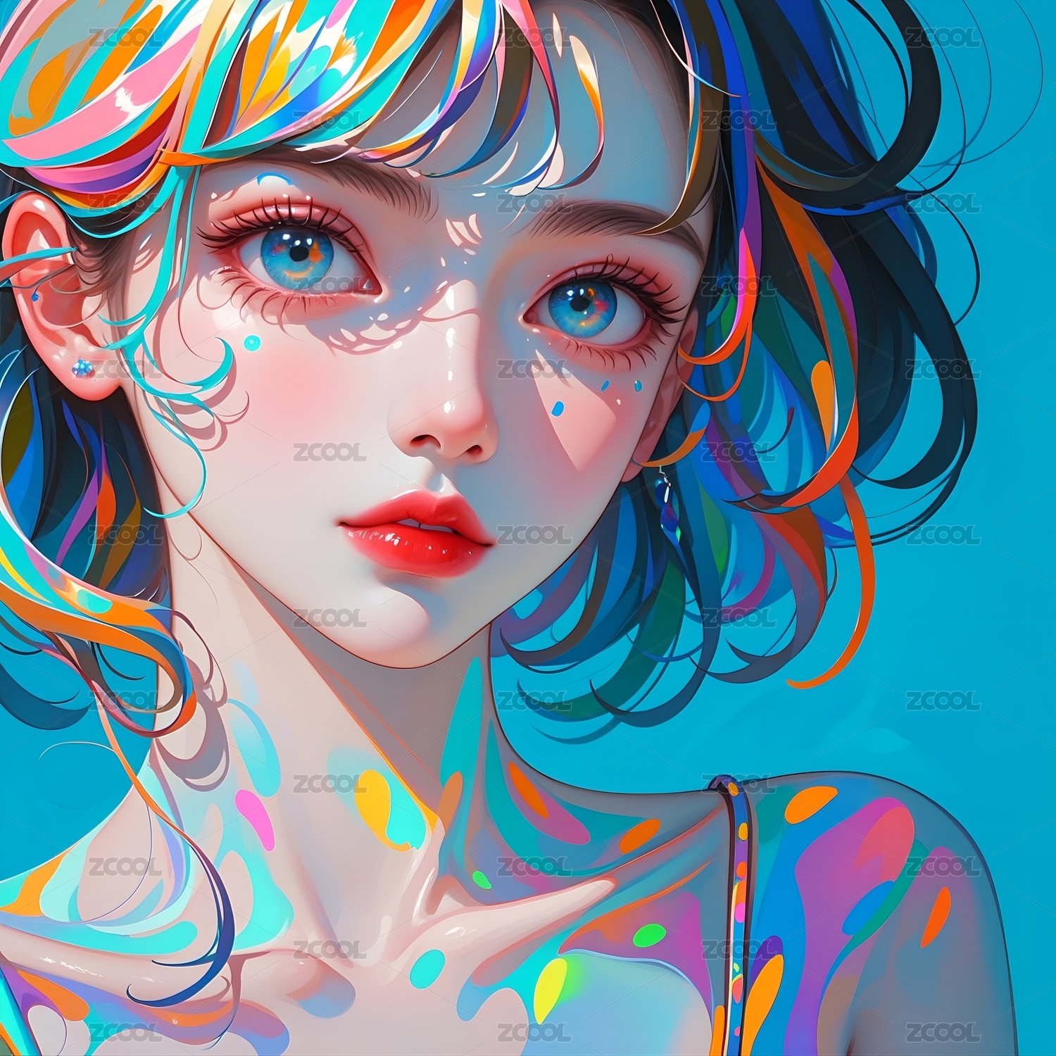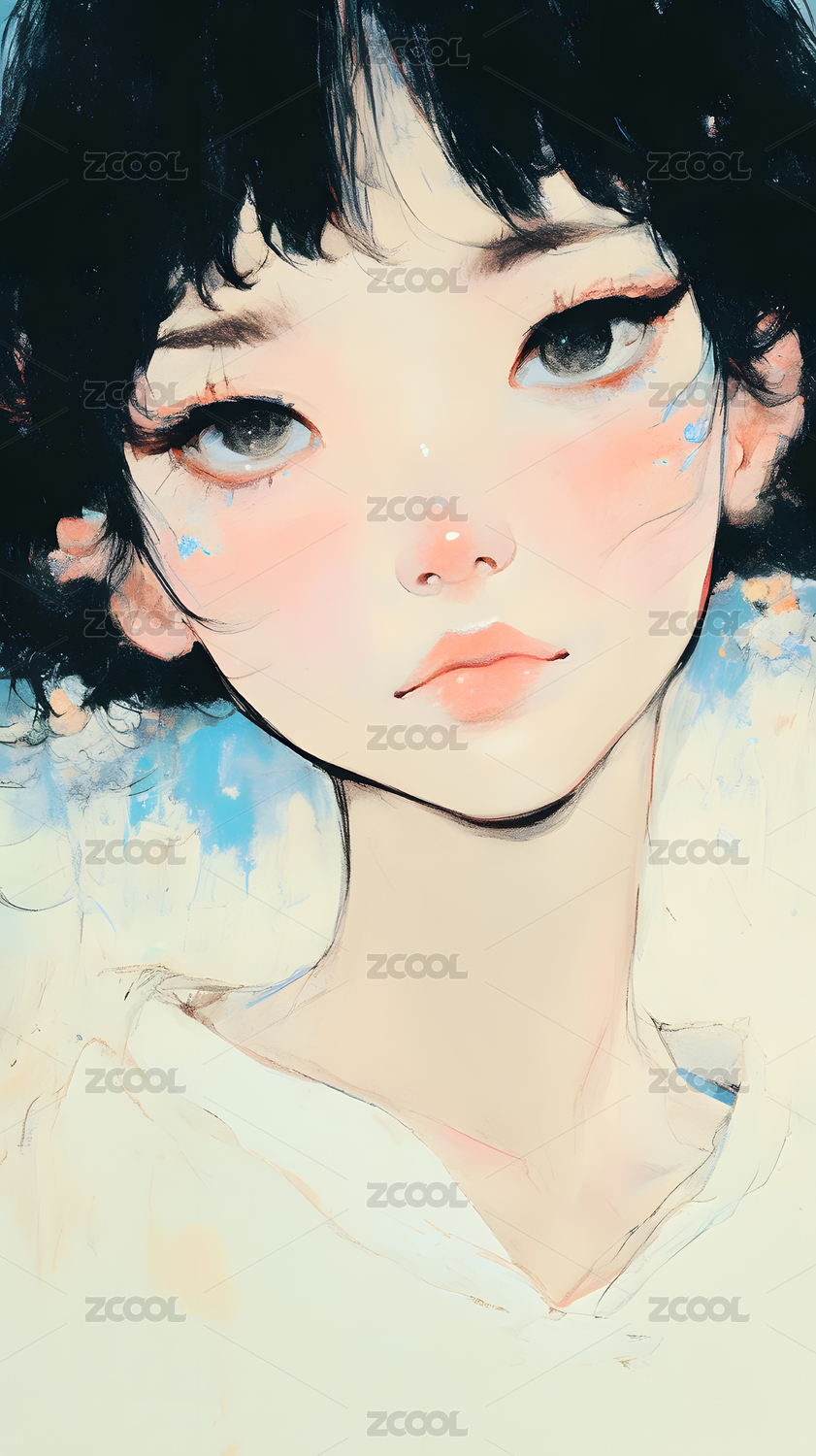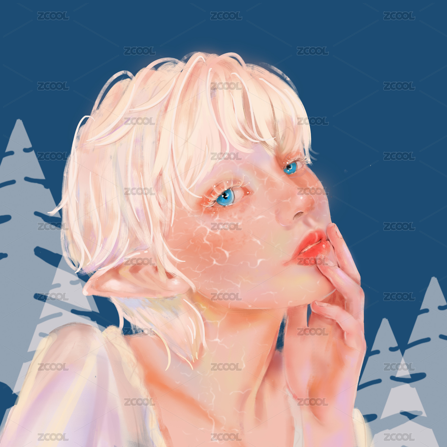 蓝色花朵下的少女红背景唯美悲伤插画油画