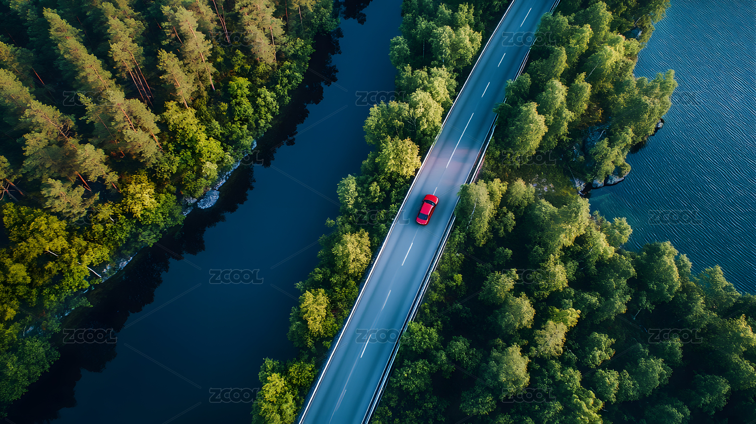 一辆小车通过一个坐落在纯绿色背水面的桥梁