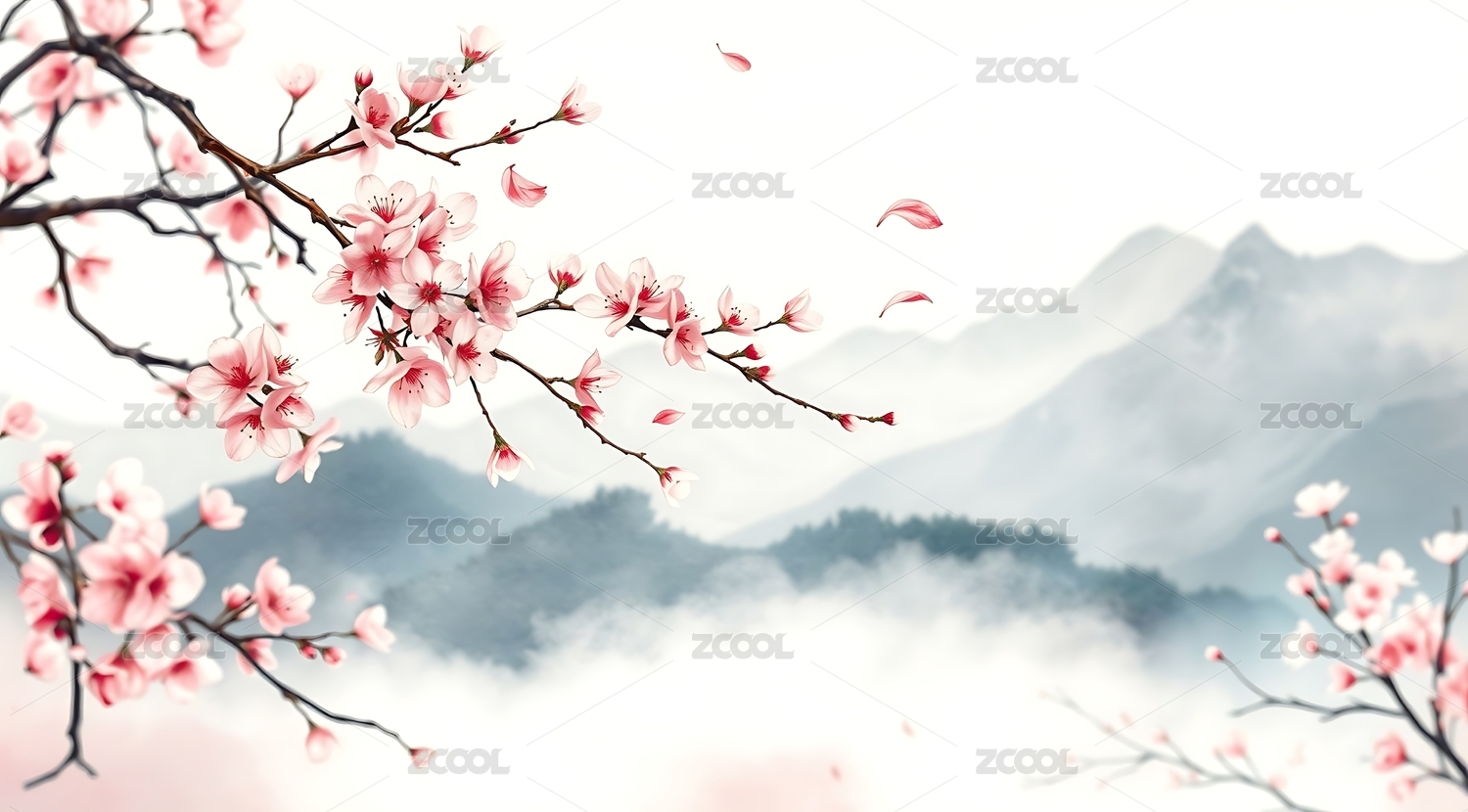 水墨山峦红梅盛开