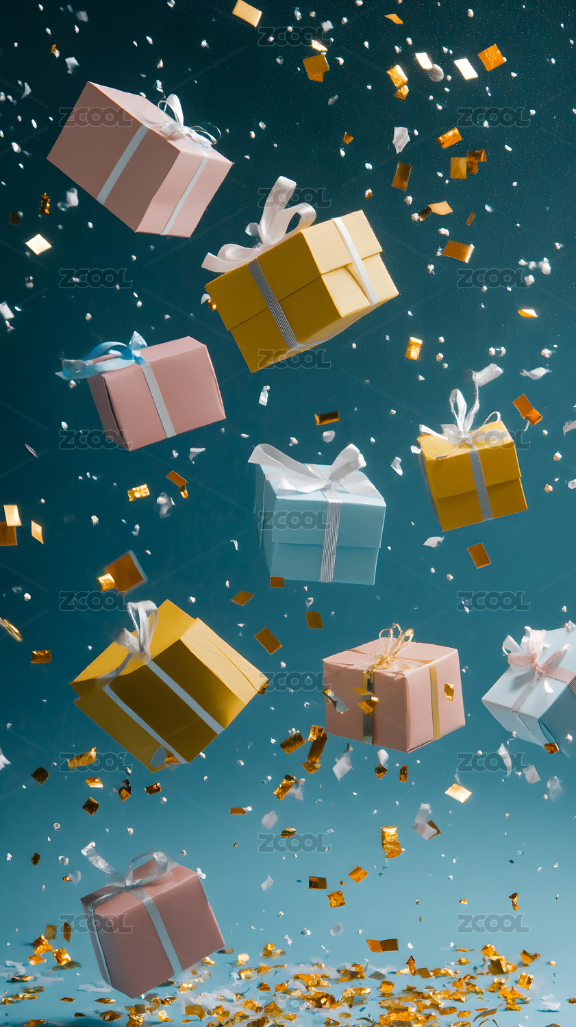 漂浮的礼物盒和五彩纸屑