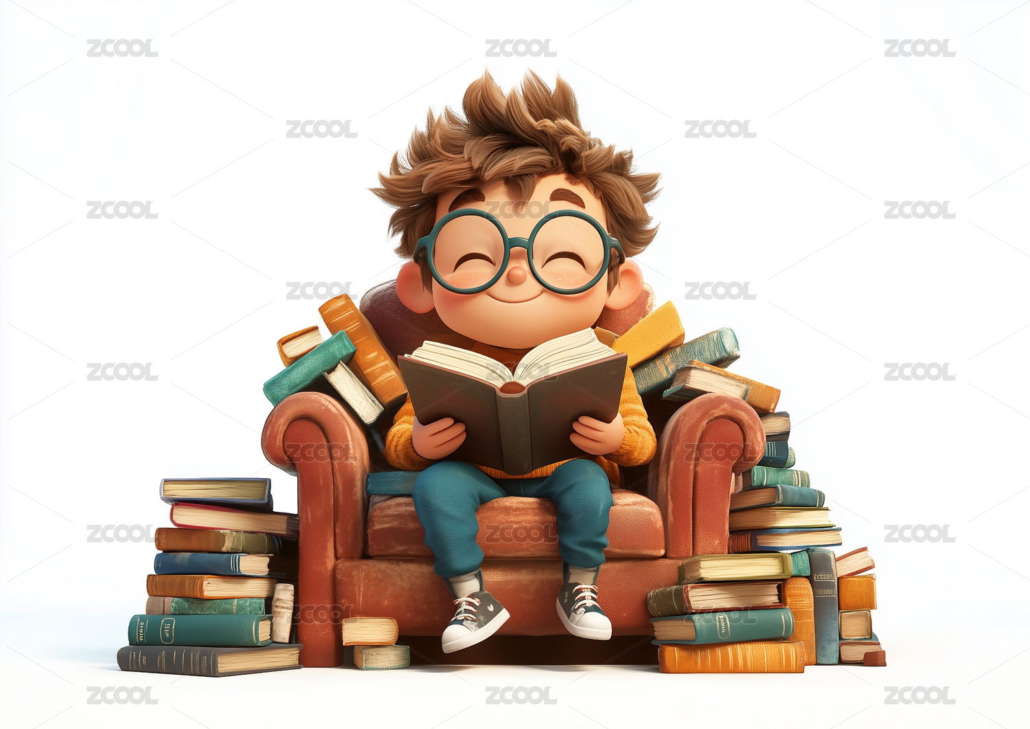 白底3D卡通风格坐在书本上微笑看书的儿童