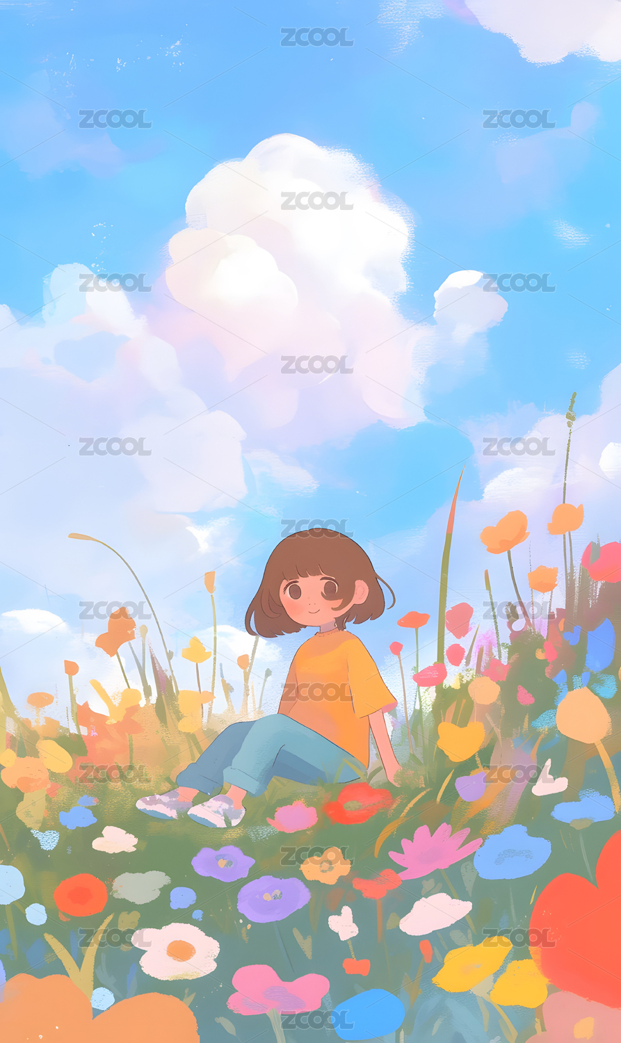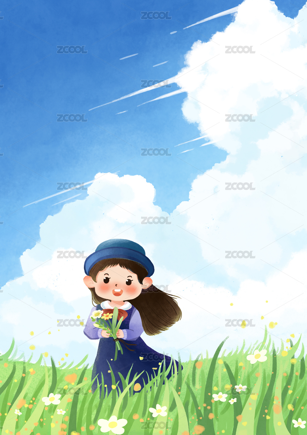 美好的春日里小女孩在山坡上吹泡泡 版绘