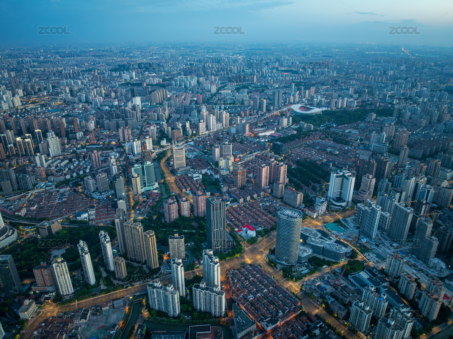 鸟瞰黎明时分的上海市中心区