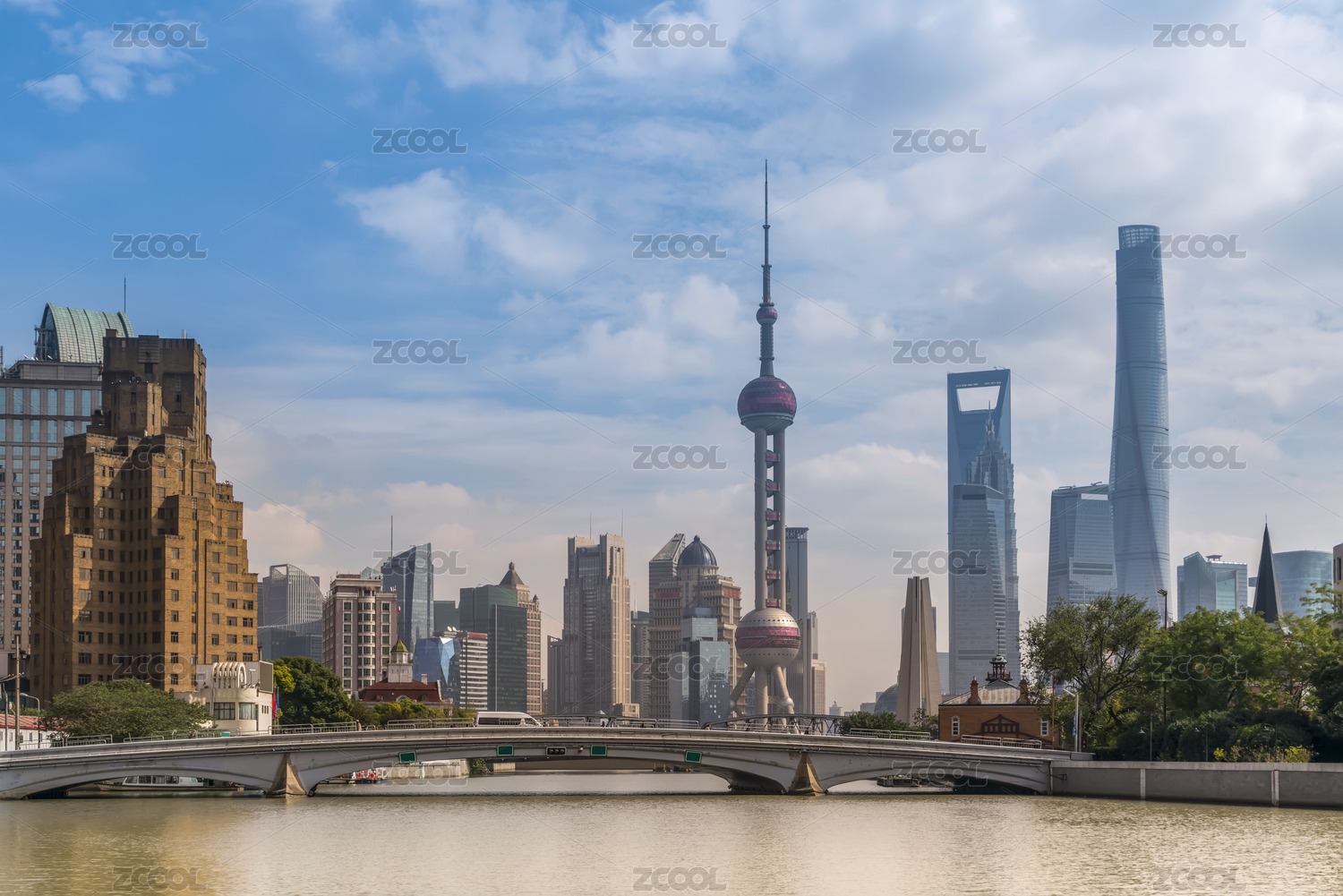 上海乍浦路桥 外白渡桥与陆家嘴城市天际线