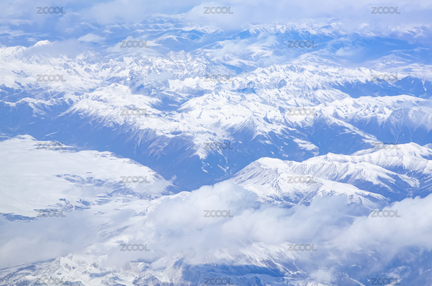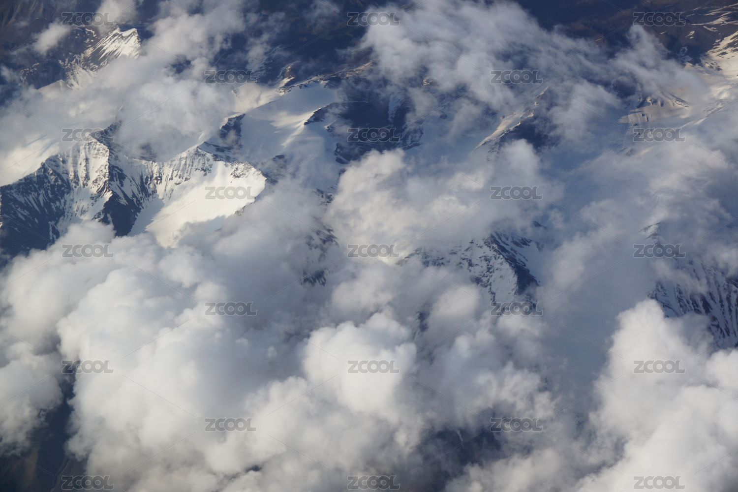 俯拍中国新疆地区云雾缭绕的雪山风景