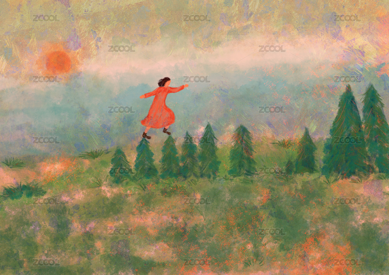 粉彩,插画,风景,植物,花,花朵,绿色,粉色,自然风景