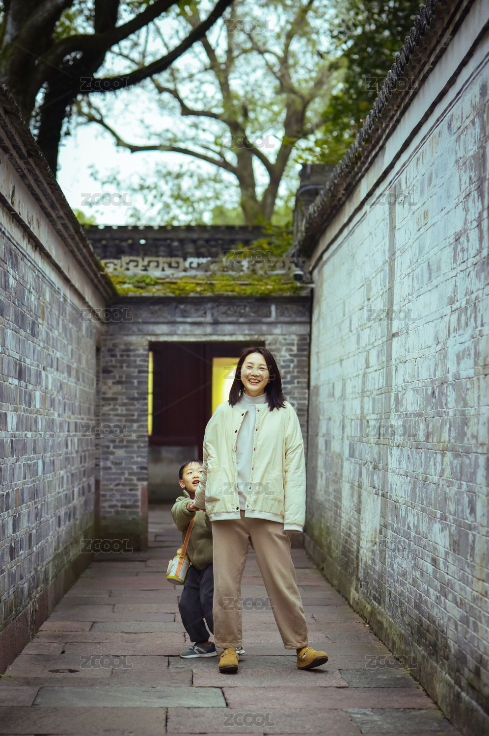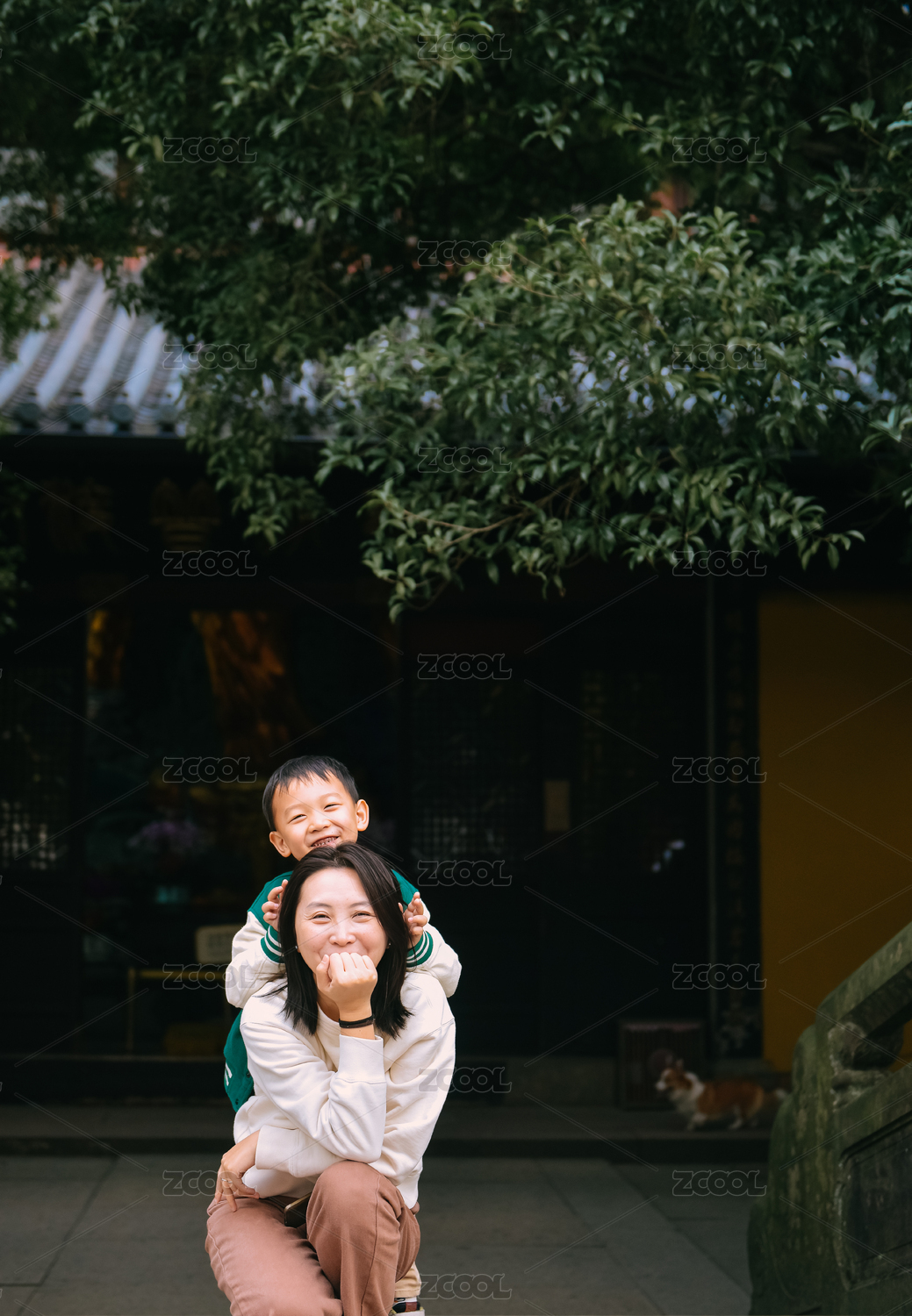 母亲与孩子在浙江宁波鄞州区阿育王寺游玩