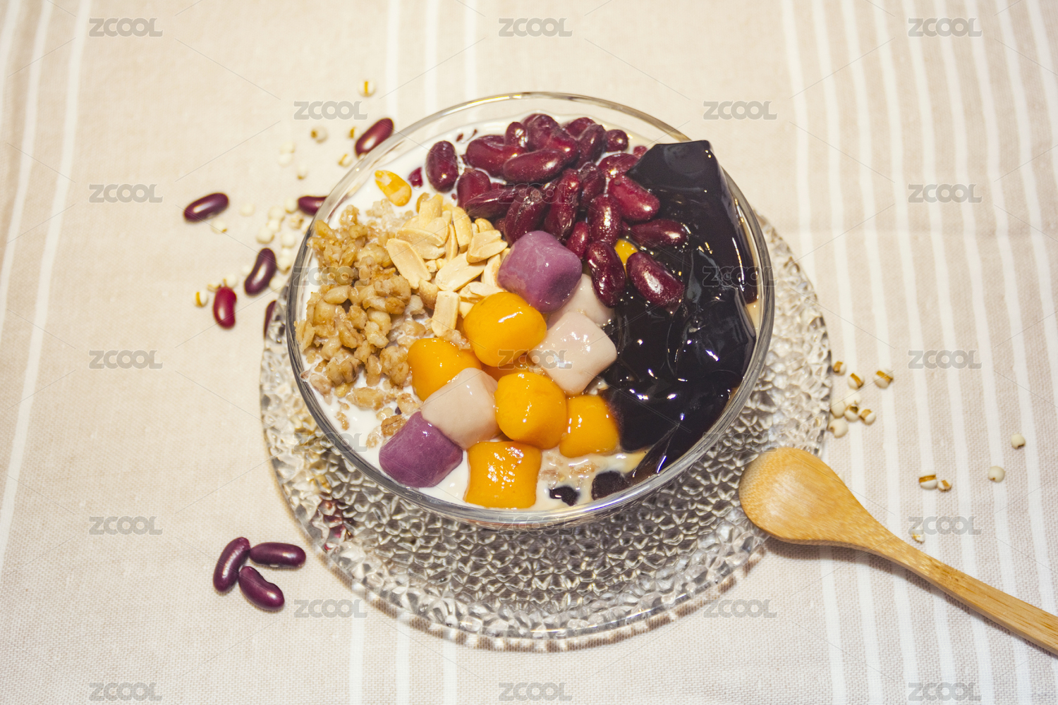 一碗烧仙草芋圆放在室内铺有黄白条纹亚麻桌布的桌子上旁边散落有红豆薏米