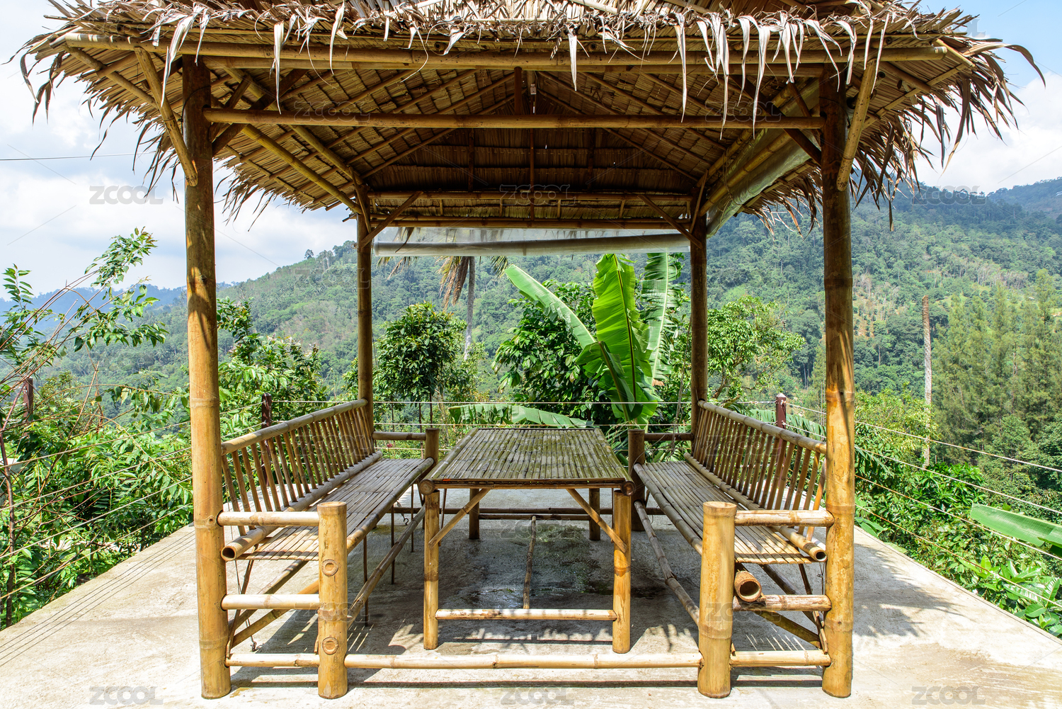 餐厅,户外,庭院,东南亚,热带,用餐区,桌椅,遮阳伞,茅草屋顶,木质结构