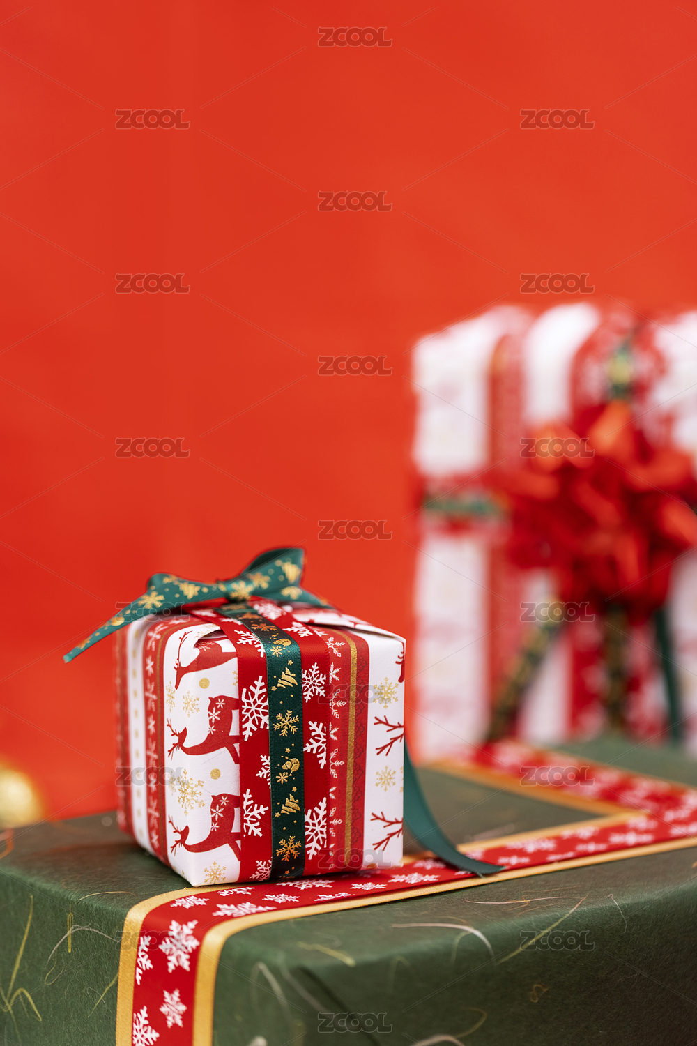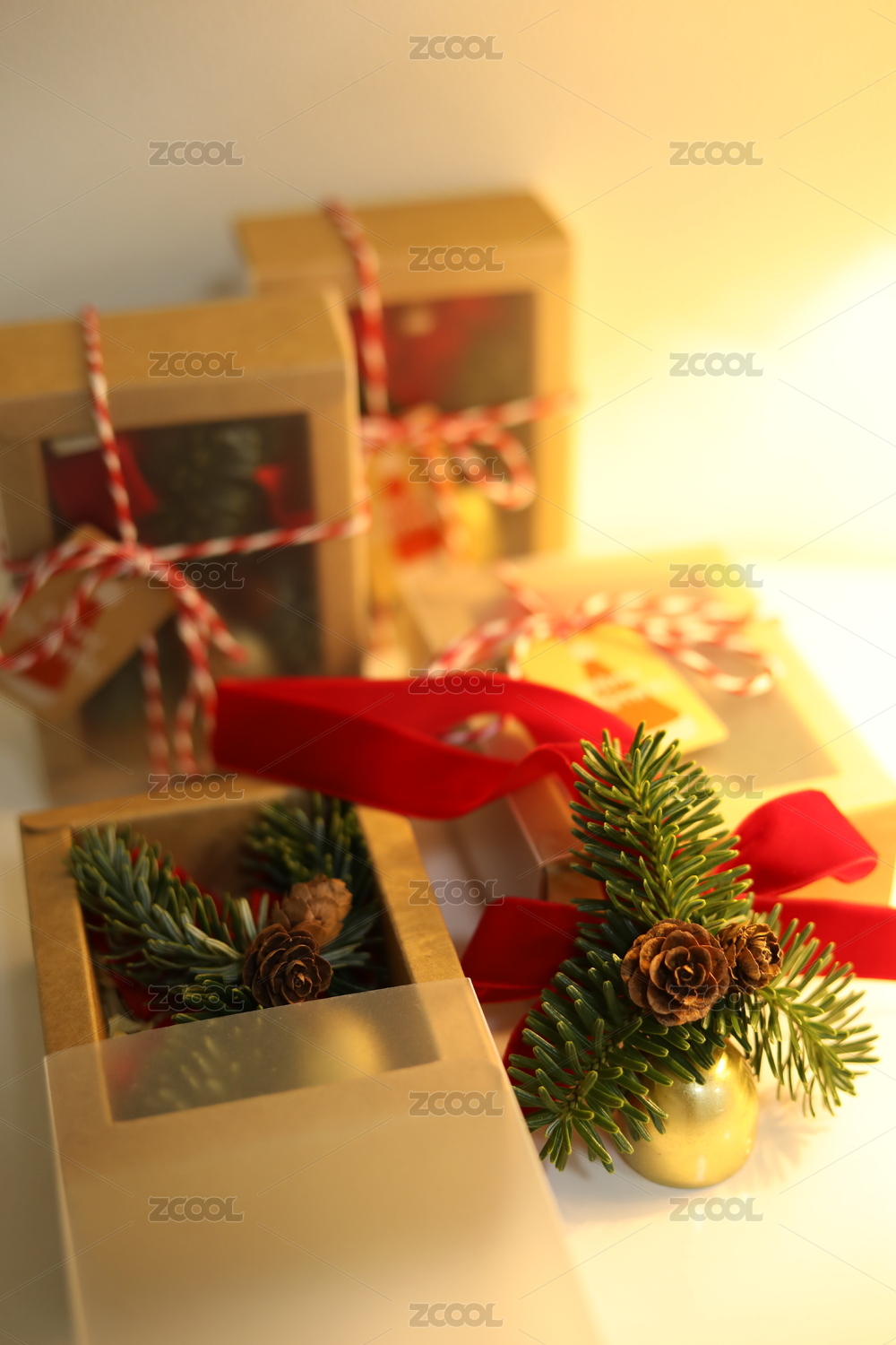 圣诞节布艺装饰和金色礼物盒放在白色木板上