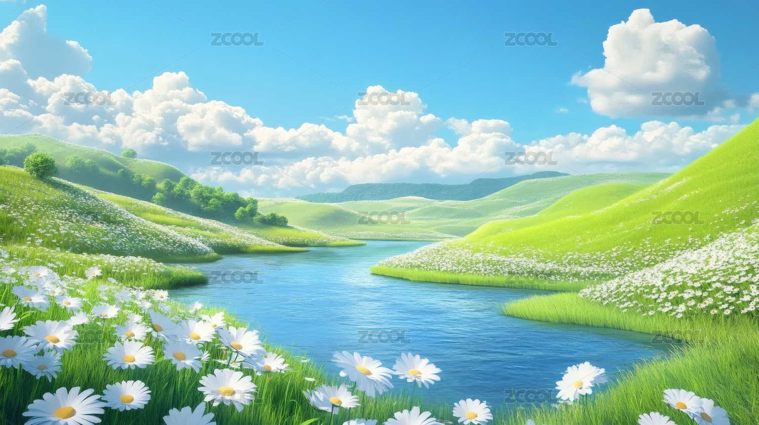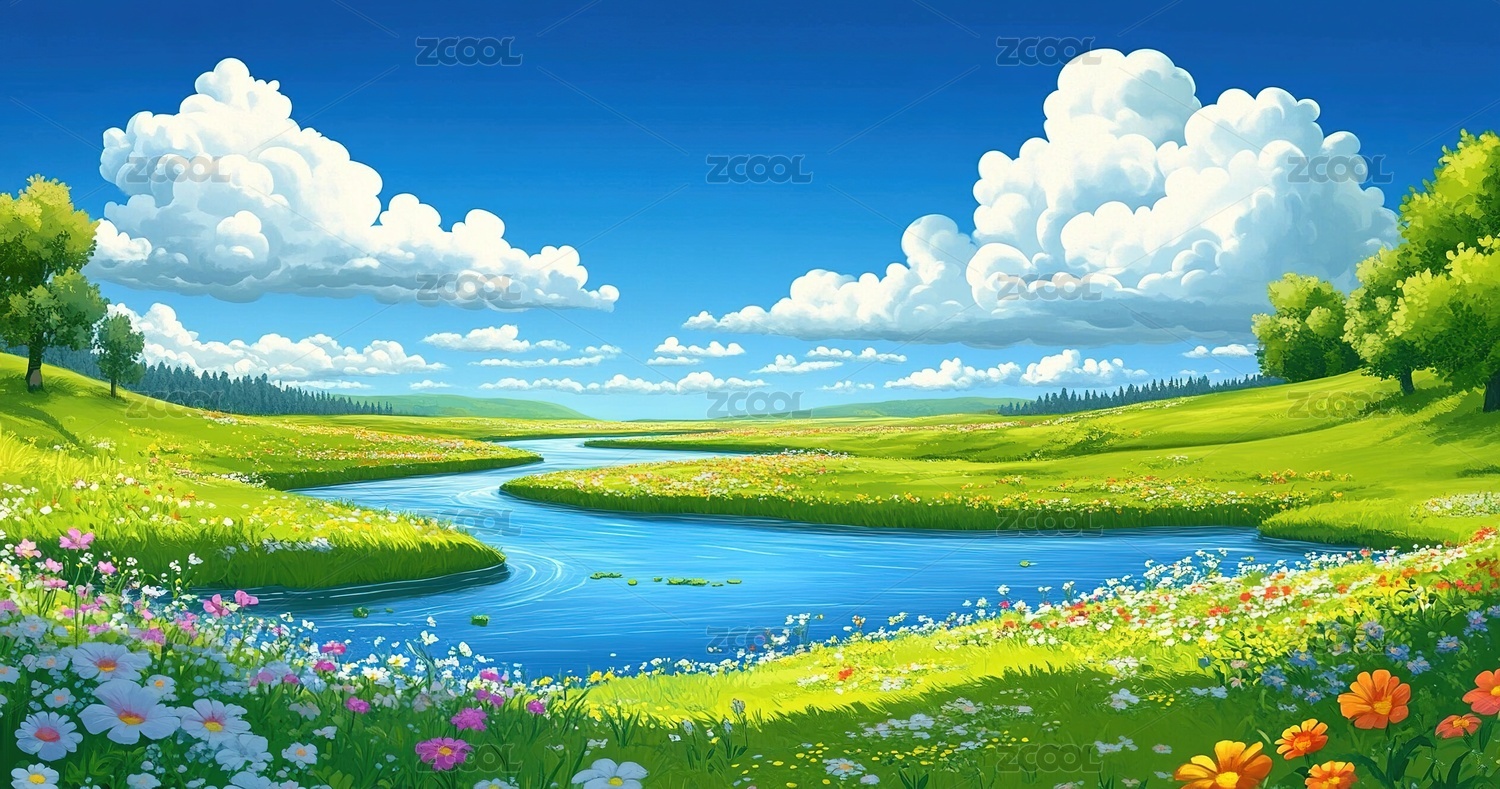 夏天户外旅行山峰房屋乡村风景蓝天白云插画