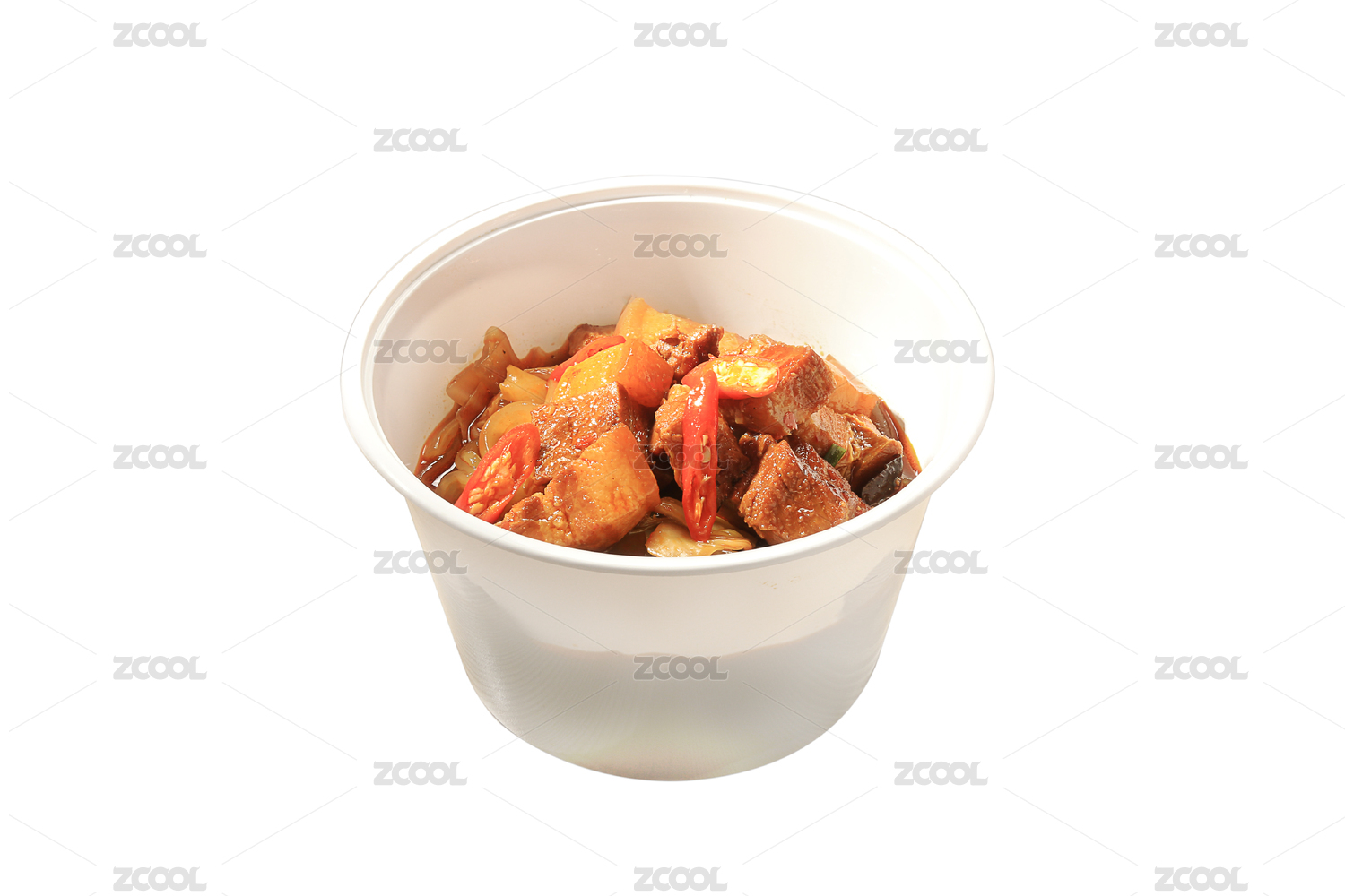 白色背景上白色打包盒中的粉条煲