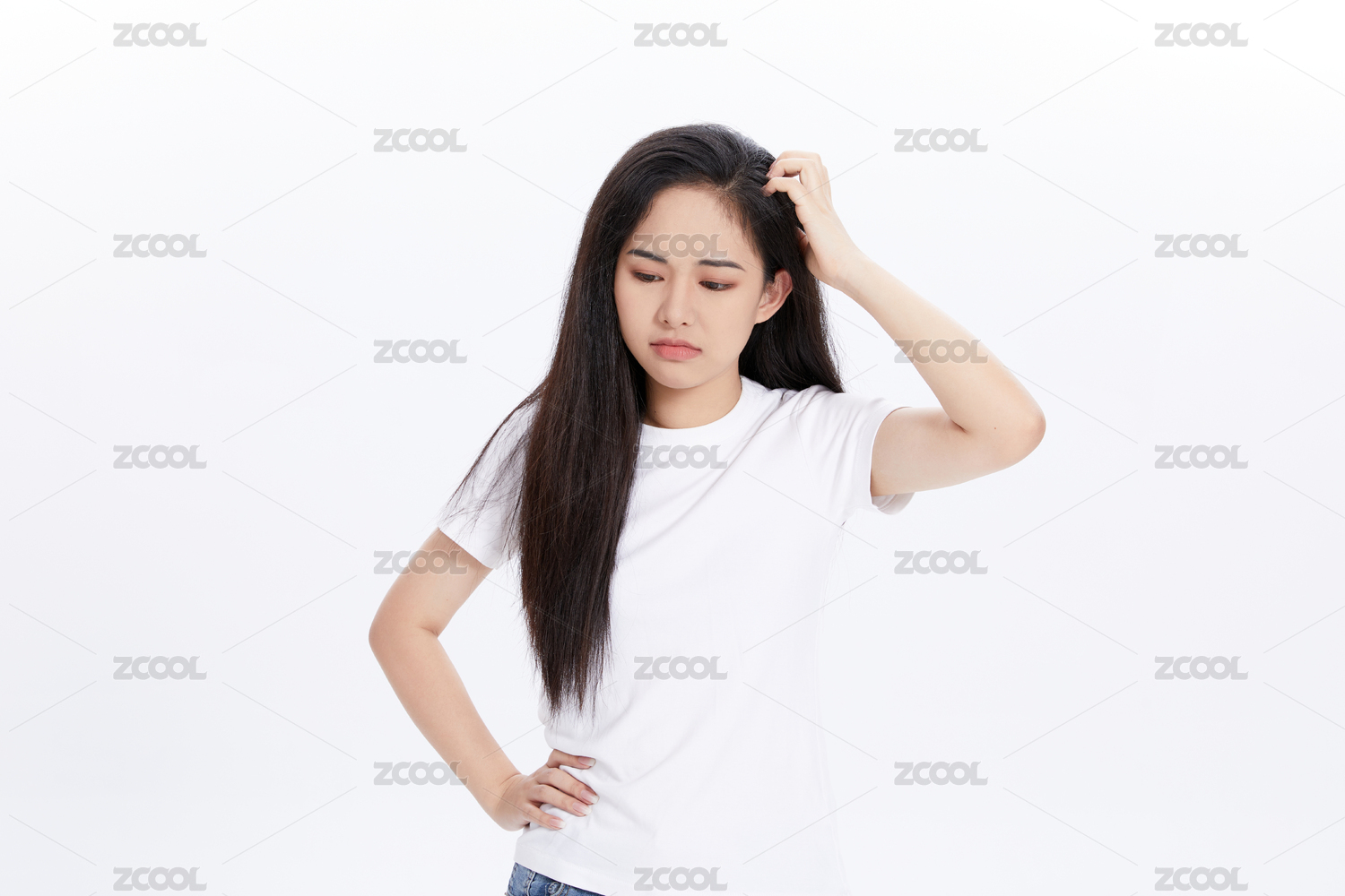 女性,大学生,白底,长发,T恤,休闲装,女孩,思考,困惑,沉思