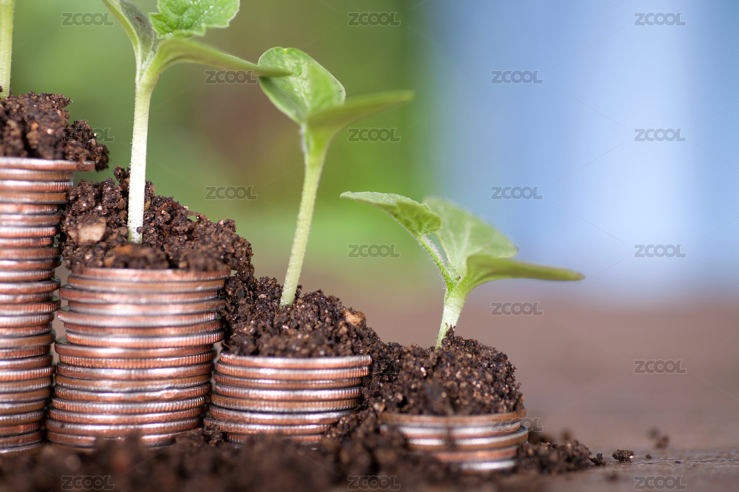 土壤里冒出一堆递增的美元硬币且硬币上都长出嫩芽