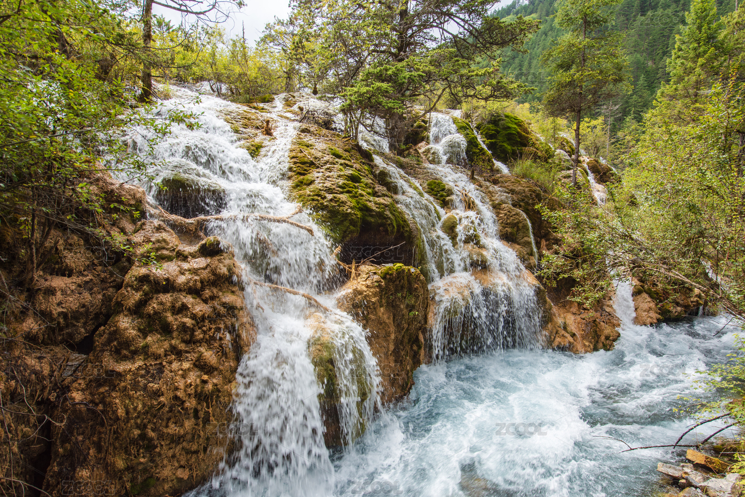四川,九寨沟,瀑布,水流,白色,树木,晴天,白云,钙华,落差